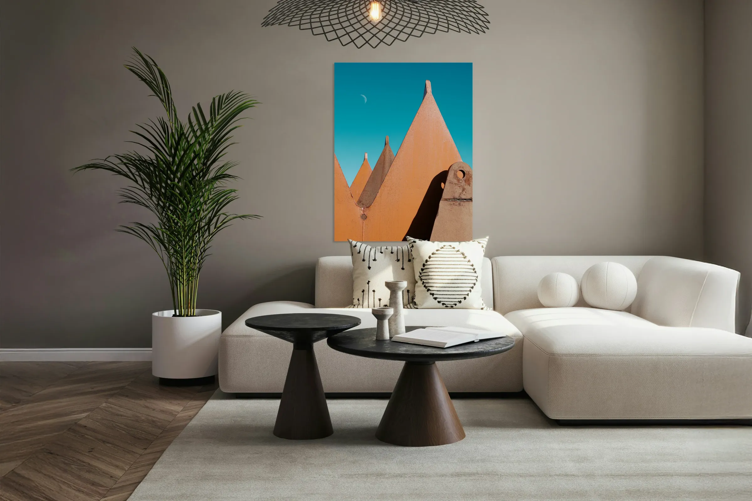 A captivating abstract photograph of rusting metal parts in a shipyard creatively forming shapes reminiscent of mountain peaks and a surreal landscape. The composition is further enhanced by the presence of a crescent moon in the background. This unique image blends industrial elements with natural motifs making it a striking piece of art. Ideal for those seeking unconventional and thought-provoking visuals.