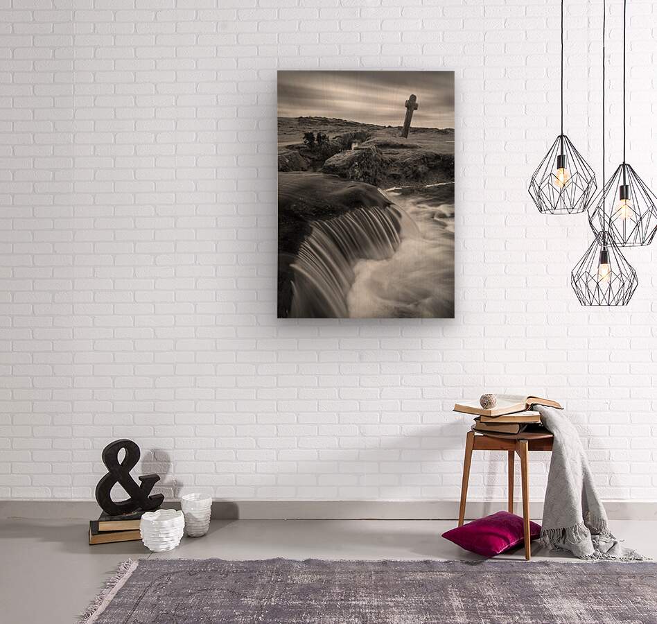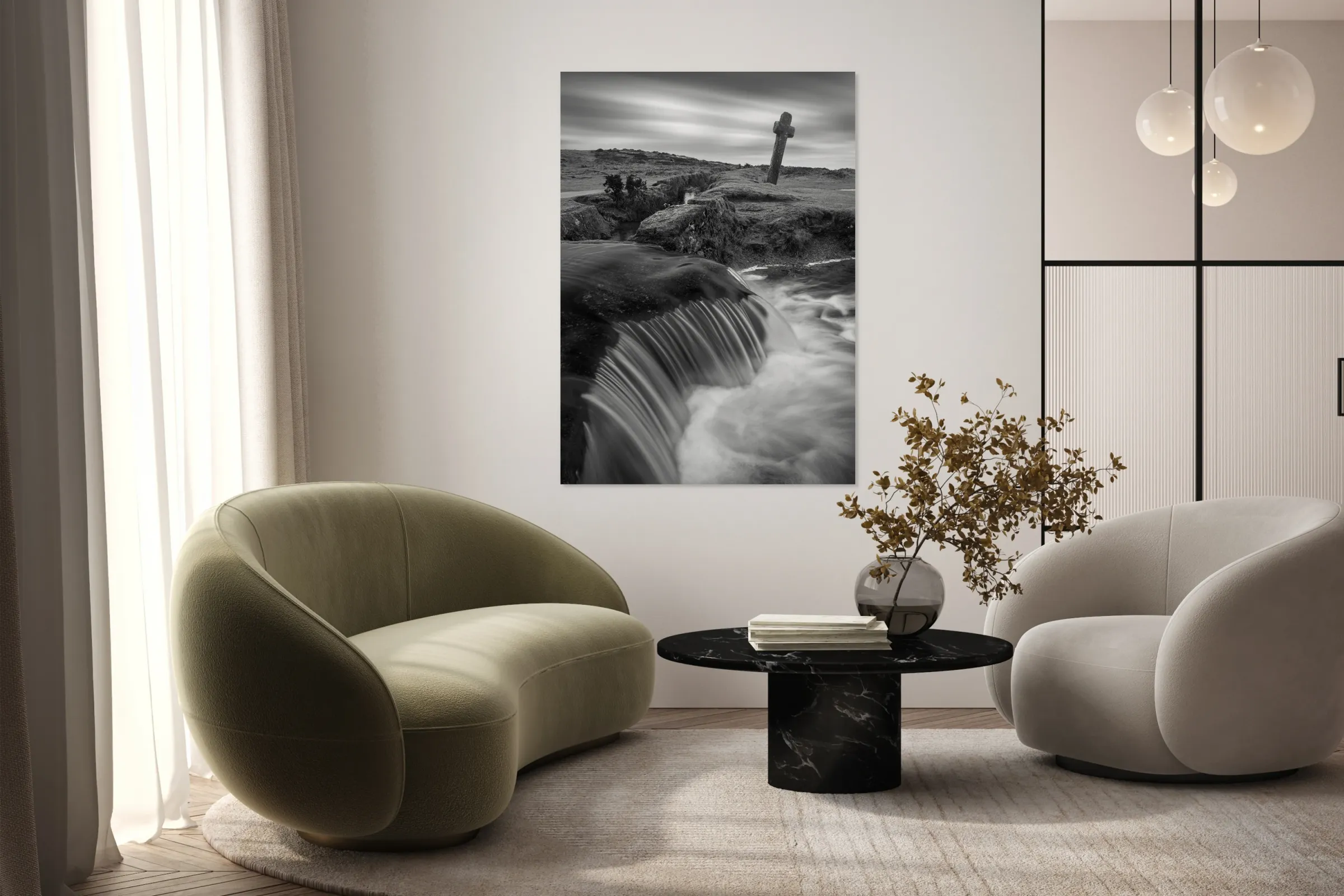 A monochrome long exposure photograph of Windy Post Cross on Dartmoor capturing the historic stone cross with a cascading stream in the foreground. Th...[+]