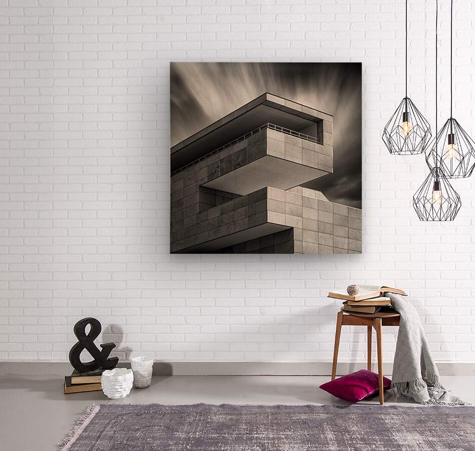 A monochrome long exposure photograph capturing the architectural study of a modern Dutch building in Rotterdam Netherlands. This striking image showc...[+]