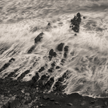 A semi-abstract monochrome study capturing the dynamic breaking waves and sea surf against Sandymouths rugged shoreline on a stormy day in Cornwall En...[+]