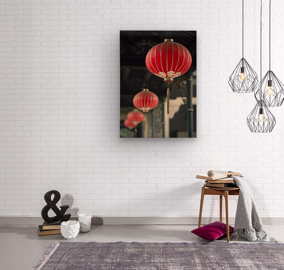 A vibrant photograph of four red Chinese lanterns hanging inside a temple in Guangzhou China. This image captures the essence of traditional Chinese c...[+]