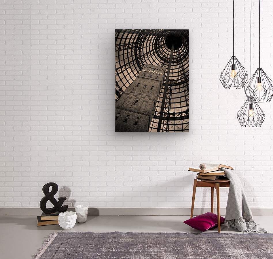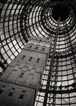 A monochrome image capturing an upward view of Coops Shot Tower preserved under a striking conical glass roof inside the Melbourne Central complex in ...[+]