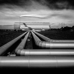 A monochrome long exposure image of the Reykjanesvirkjun geothermal power plant in Iceland. This photograph highlights the silver pipes extending towa...[+]