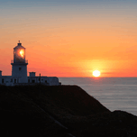 A panoramic view of Strumble Head at sunset featuring the lighthouse silhouetted against a vivid orange sky with the setting sun. The lighthouse light...[+]