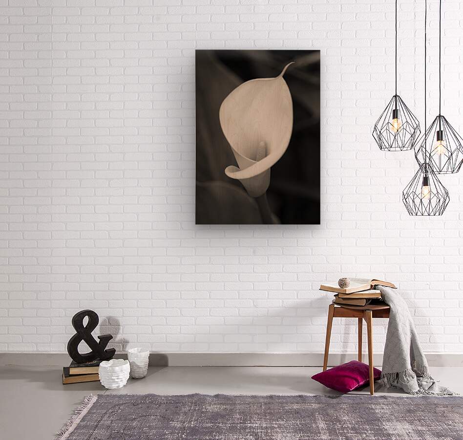 A monochrome photograph of a delicate calla lily highlighting the elegant curves and smooth lines of its form. The subtle interplay of light and shadow creates depth and texture within the petals offering a contemplative view of natures beauty. Ideal for minimalist decor nature enthusiasts or for those seeking refined botanical art