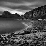 A monochrome long exposure photograph captures the dramatic heavy clouds hovering above the Cuillin mountain range. Taken from the rugged rocky shores...[+]