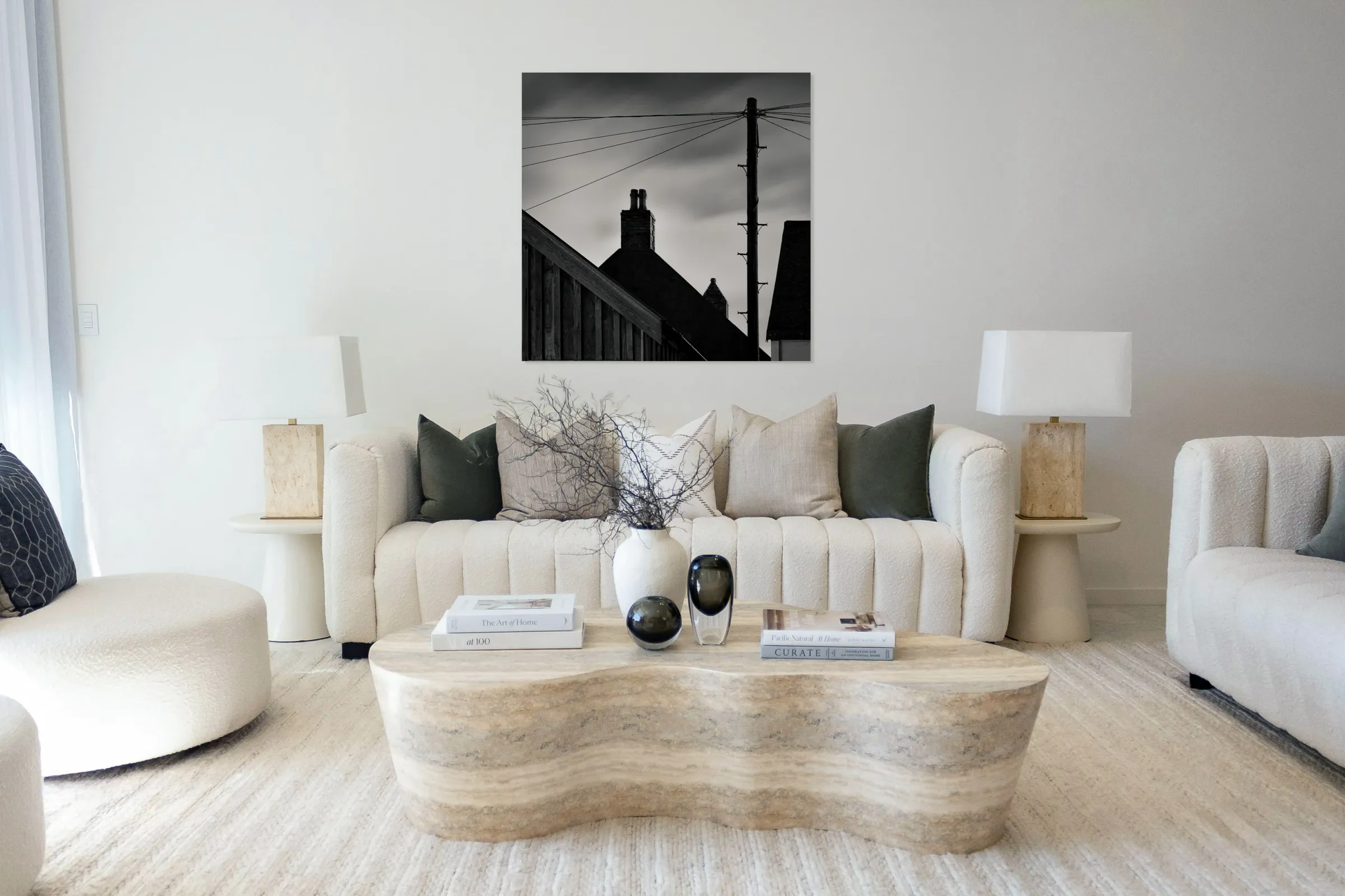 A monochrome long exposure photograph captures the silhouettes of Footdee rooftops at night against a cloudy sky. Footdee also known as Fittie is an old fishing village located at the east end of Aberdeen Harbour in Scotland. This minimalist image highlights the distinctive rooftops chimney stacks and a telegraph pole creating a serene and timeless scene. Perfect for those who appreciate minimalist photography and the historic charm of Aberdeens coastal architecture.