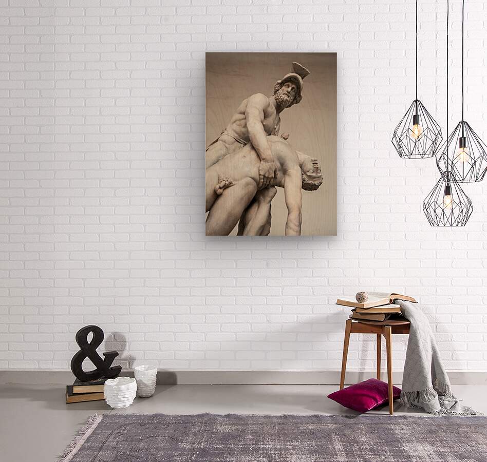 A photograph capturing the famous Menelaus Supporting the Body of Patroclus sculpture prominently displayed in the Loggia dei Lanzi gallery on Piazza della Signoria in Florence Italy. This image features the intricate details and dramatic composition of the classical masterpiece highlighting the sculptures historical and artistic significance. Ideal for enthusiasts of Renaissance art and classical sculptures.
