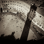 A monochrome sepia-toned photograph of the famous Piazza del Campo in Siena Italy captured from an elevated perspective. This image prominently features the shadow of the Torre del Mangia cast over the historic square highlighting the architectural details and layout of this renowned landmark. Ideal for enhancing historical or travel-themed decor this photograph offers a timeless view of one of Italys most iconic locations.