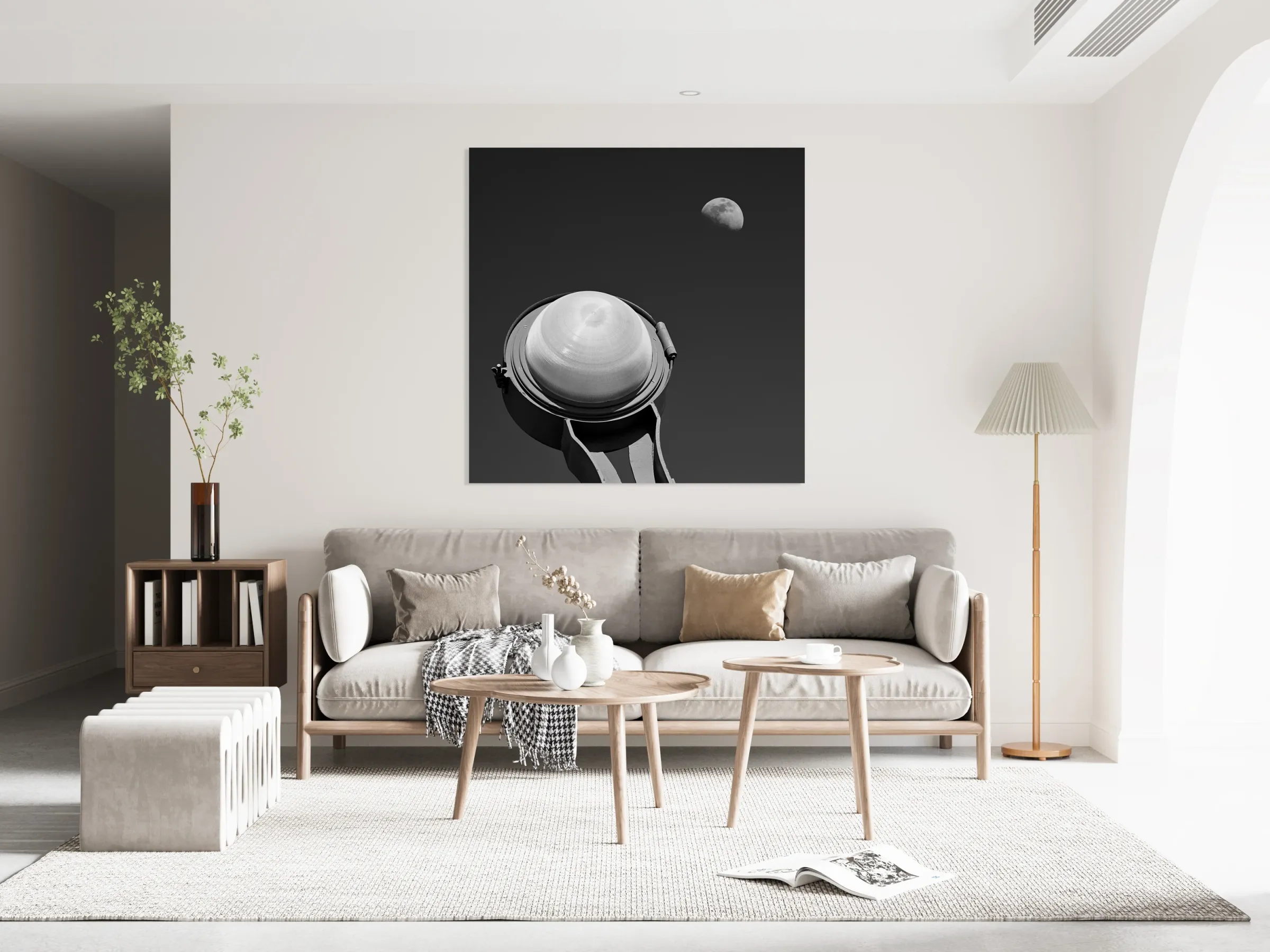 A monochrome photograph of a bridge lamp on San Franciscos iconic Golden Gate Bridge with the moon visible in the background. This image captures the lamp and the moon as the only visible elements with the round white lamp mirroring the shape of the moon. The composition emphasizes the visual similarity between the two circular objects against the sky. Ideal for those seeking a dramatic and minimalist view of a famous San Francisco landmark.
