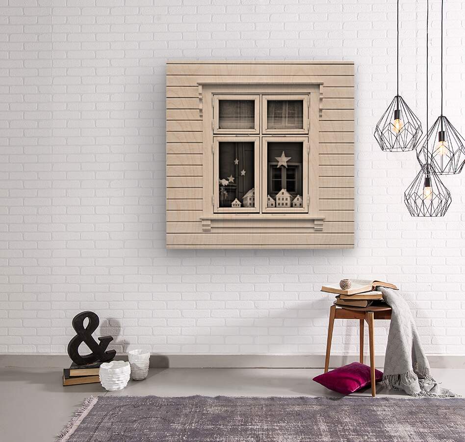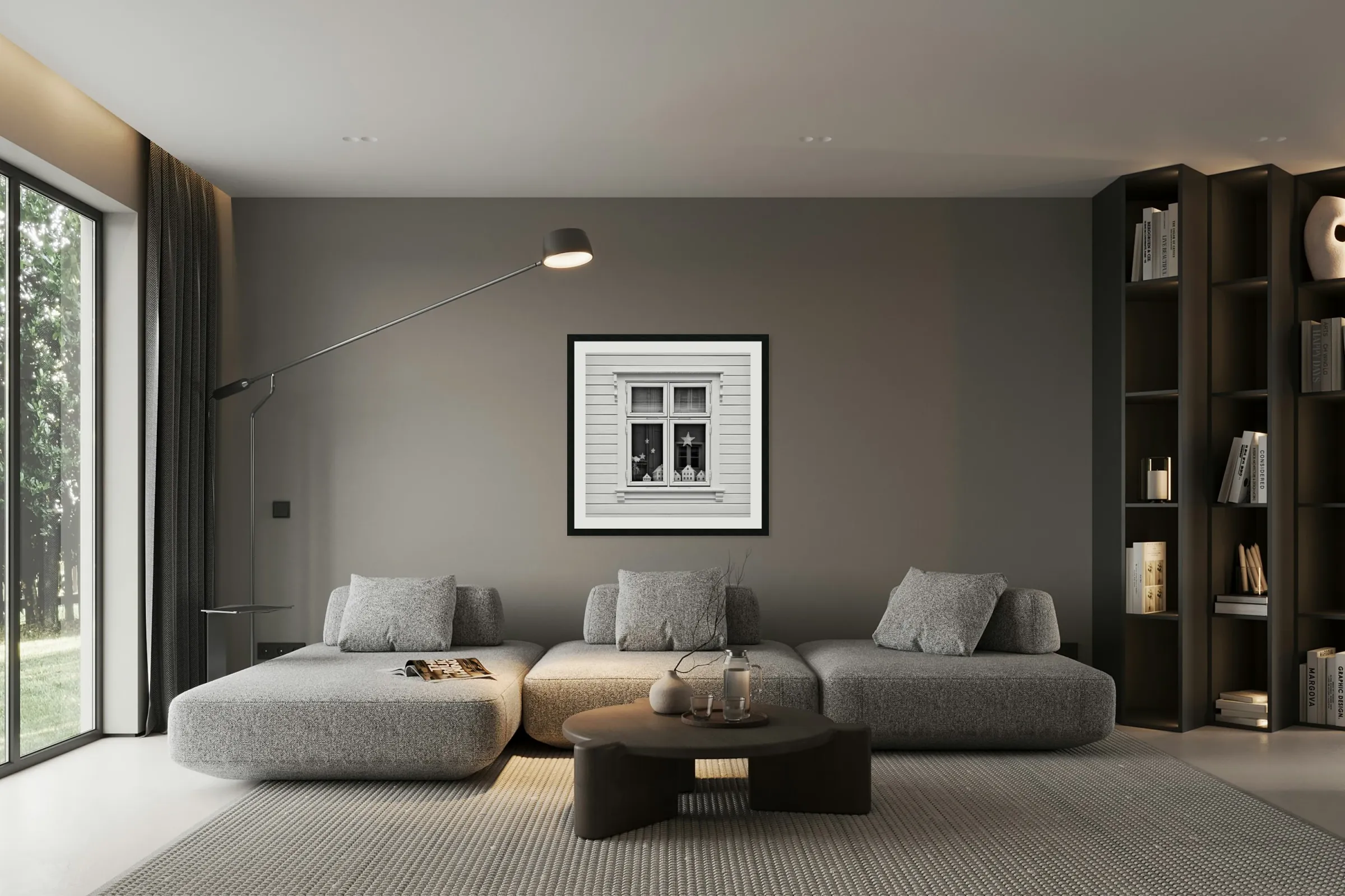 A monochrome photograph capturing model houses displayed in the window of a traditional Norwegian home in Bergen Norway. This image explores the concept of houses within a house highlighting the architectural similarities between the miniature models and the actual building. The photograph provides a striking visual contrast and perspective on domestic structures blending the intricacies of scale models with real-life architecture. A great photograph for enthusiasts of architectural details and those interested in unique perspectives on home design.