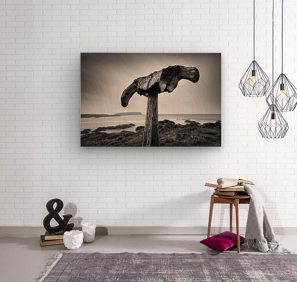 A monochrome photograph capturing an ancient whalebone mounted on a wooden pole at Skiba Geo Orkney Scotland. This historic artifact set against the rugged coastal landscape provides a striking representation of Orkneys maritime heritage. The black-and-white tones emphasize the texture and age of the whalebone offering a powerful visual connection to Scotlands past. A perfect photograph for collectors historians or anyone interested in Scottish history and coastal artifacts.