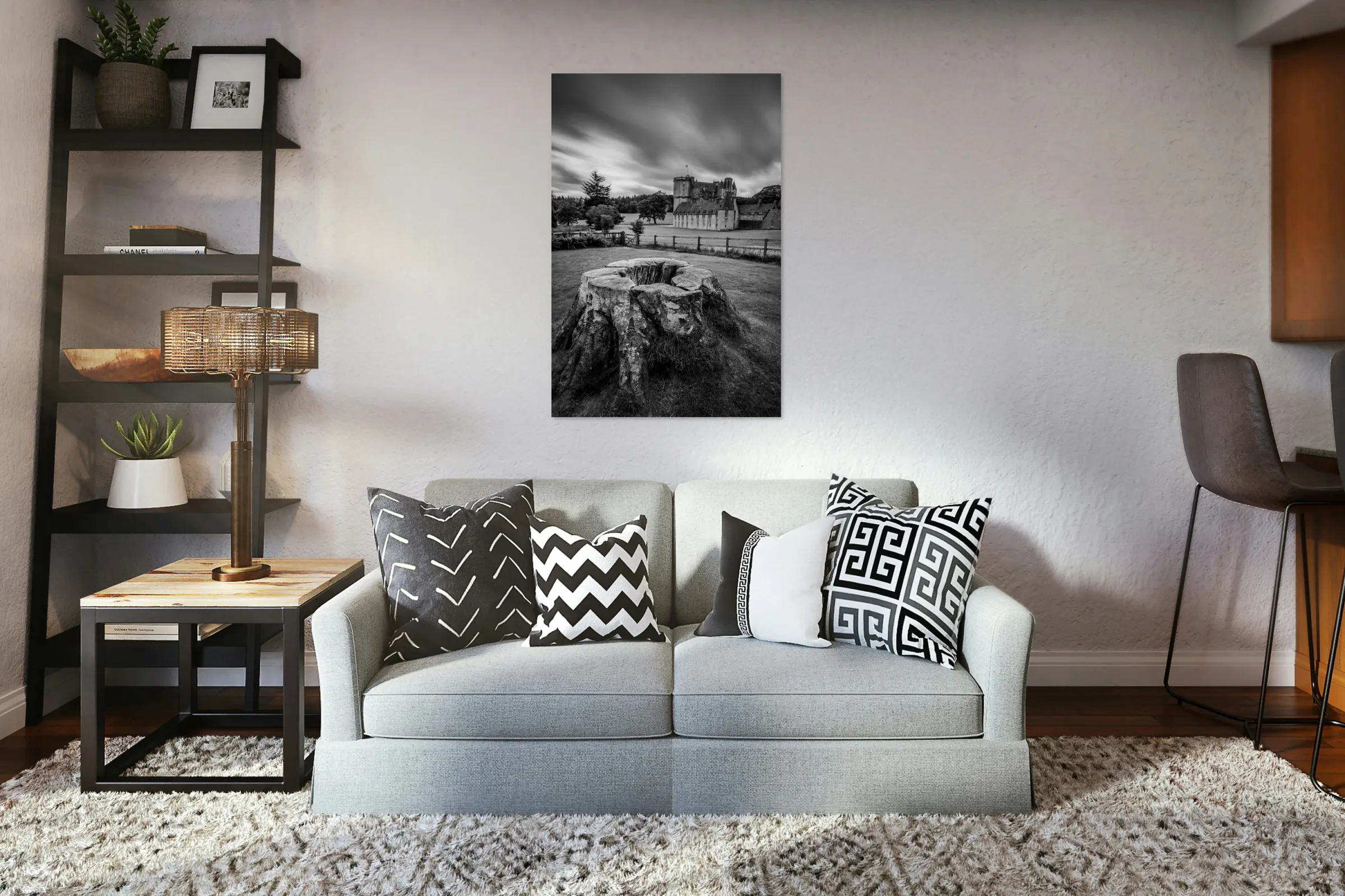 A monochrome long exposure photograph of Castle Fraser in Aberdeenshire Scotland captured on an overcast day. The image features an old tree stump in the foreground with the historic castle prominently displayed in the background. This detailed black and white photograph highlights the timeless architecture of Castle Fraser amidst a dramatic and moody landscape. The ideal photograph for enthusiasts of historical architecture landscape photography and Scottish heritage.