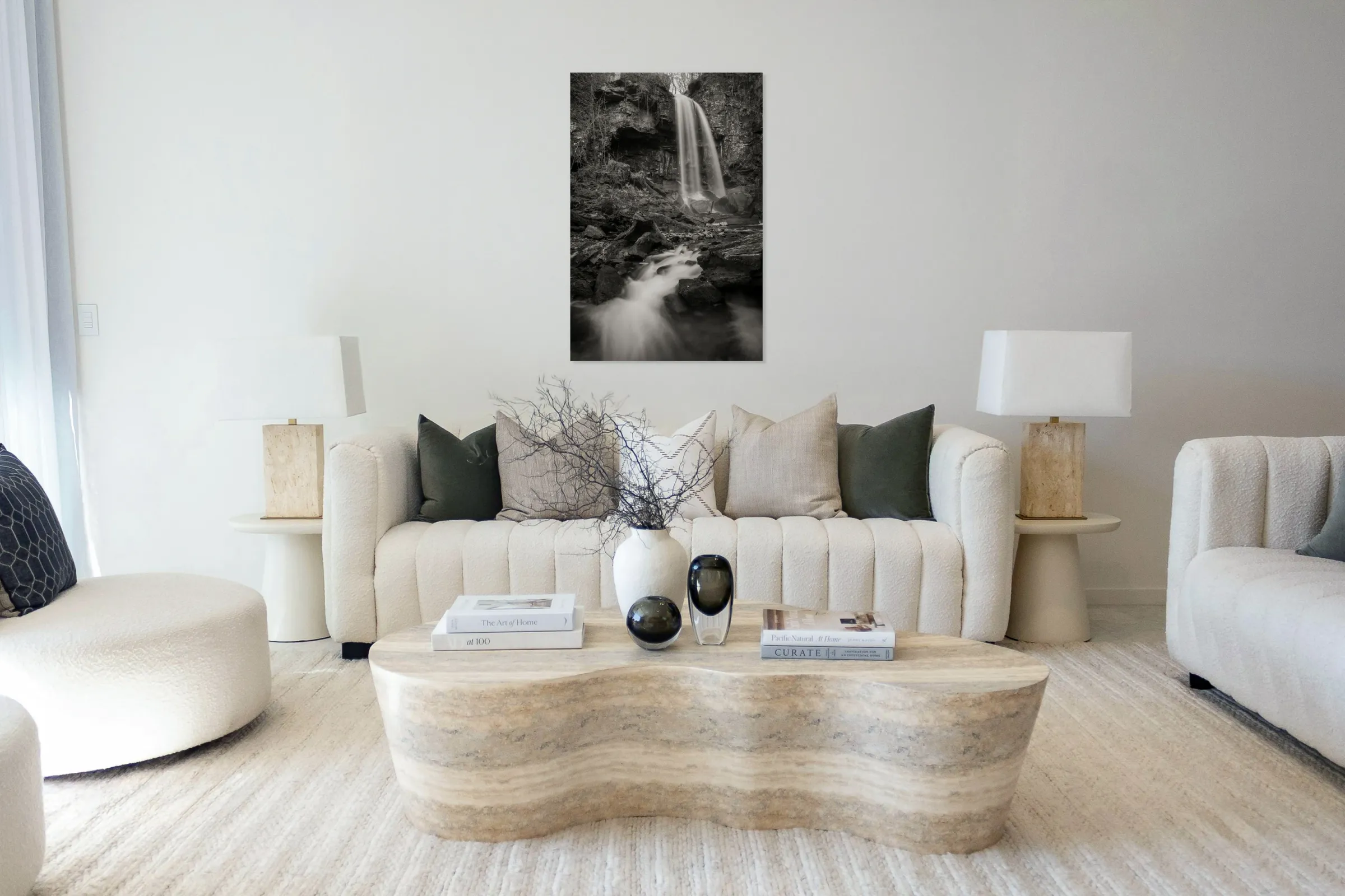 A monochrome long exposure photograph capturing the dramatic Melincourt waterfall as it cascades 80 feet over rugged rocks into Melin Court Brook. Loc...[+]