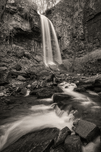A monochrome long exposure photograph capturing the majestic Melincourt Waterfall as it cascades 80 feet over rugged rocks into Melin Court Brook. Thi...[+]