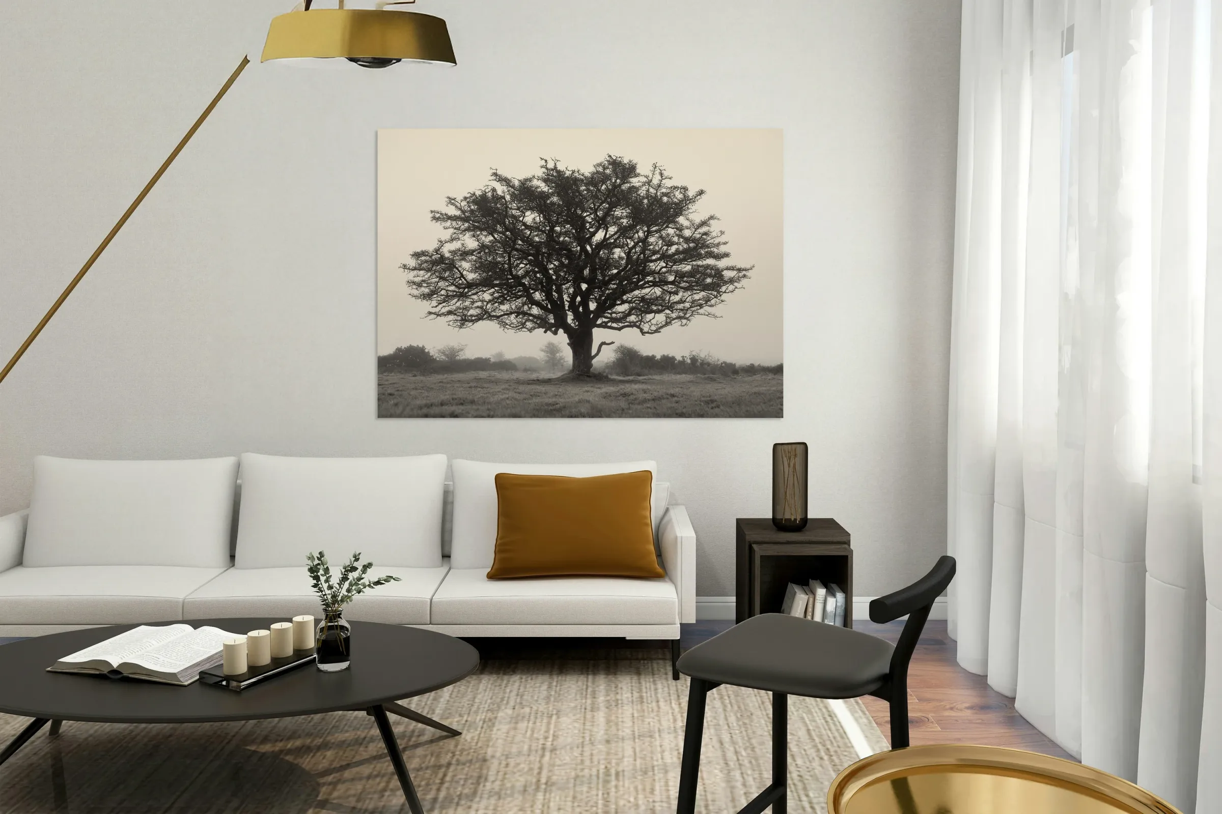 A monochrome photograph of a solitary tree standing alone in the mist casting an ethereal aura across the foggy landscape of Exmoor Somerset England. The scene captures the quiet beauty and mysterious atmosphere of the moorland with the trees silhouette sharply contrasting against the soft diffused light. This image emphasizes the tranquil and hauntingly beautiful essence of nature in the English countryside. A great photograph for those seeking to add a touch of natural serenity and timeless elegance to their collection.