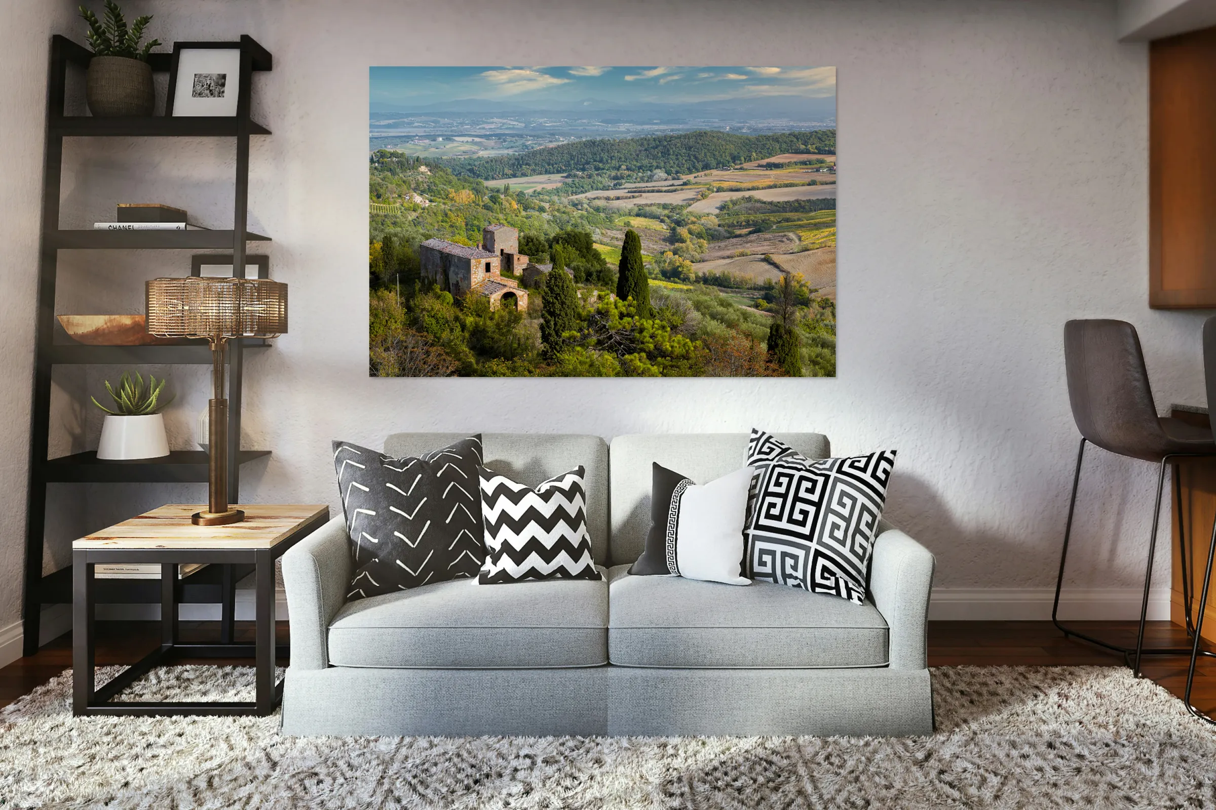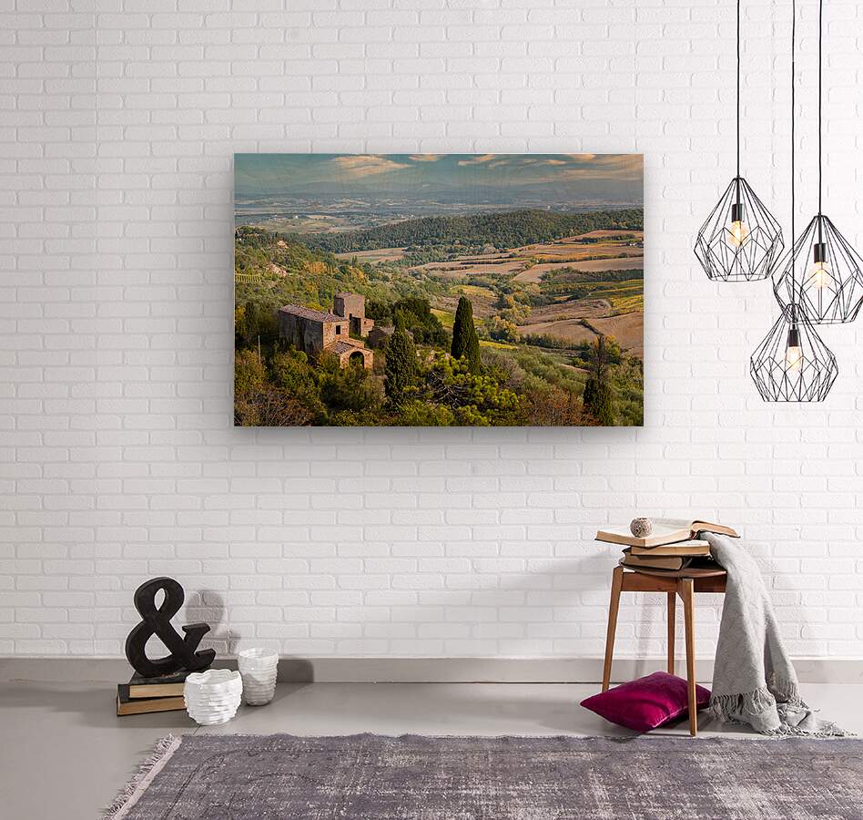 A view across the Tuscan countryside with a rustic building in the foreground, set against the rolling landscape of Tuscany, Italy. The scene captures the authentic rural charm of the region, with its distinctive architecture and natural beauty. A perfect photograph for lovers of Italian landscapes, travel enthusiasts, or anyone looking to bring a piece of Tuscany into their home or office.