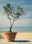 A young olive tree in a terracotta pot sits prominently in the foreground, framed against the backdrop of the rugged Amalfi Coast mountains in Italy. ...[+]