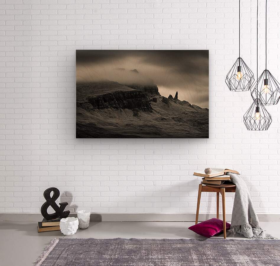 A monochrome, long exposure photograph capturing the dramatic landscape of the Old Man of Storr from Loch Fada on a moody day in the Isle of Skye, Inn...[+]