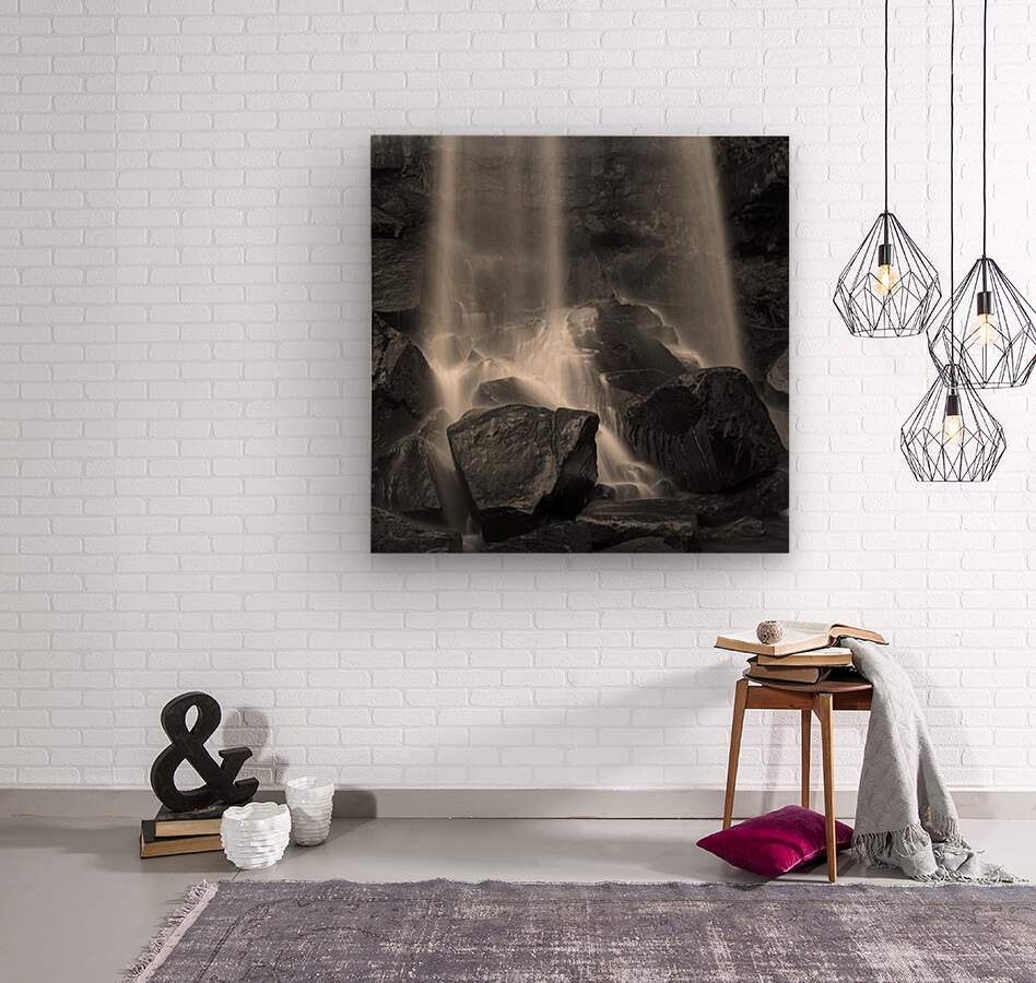 A monochrome long exposure photograph of Melincourt Waterfall, capturing the water flowing over rugged rocks at the base of the 80-foot falls. Located near Resolven in Neath Port Talbot, South Wales, this image highlights the dynamic movement and textures of the water as it meets Melin Court Brook. A great photograph for art collectors, landscape enthusiasts, or those seeking a unique visual of Welsh natural scenery.