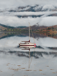 A moored sailing boat reflected in the calm waters of Loch Duich in Glen Shiel, surrounded by the rugged Scottish Highlands. The autumn scene is set with low clouds and early morning mist gently covering the distant mountains, creating a serene and atmospheric landscape. A great photograph for those seeking Scottish landscapes, nature enthusiasts, or anyone looking to add a touch of the Highlands' tranquility to their space.