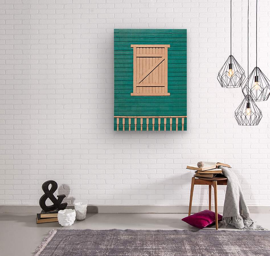 A semi-abstract photograph of a turquoise wooden building in Nevada USA. The building features an eggshell-colored shutter with a slatted Z pattern and a matching wooden railing in front. The clean lines and bold colors emphasize the architectural details. A great photograph for those interested in contemporary rustic designs or adding a pop of color and structure to their decor.