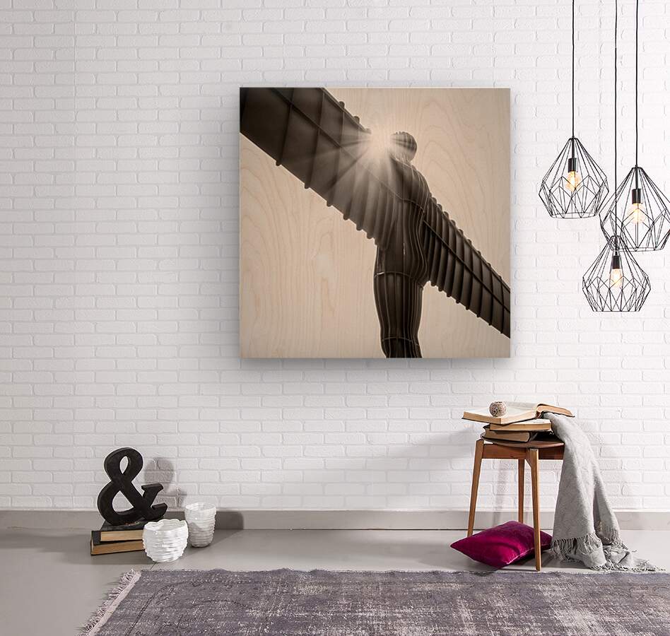A monochrome photograph of The Angel of the North sculpture with the sun positioned behind it on a bright summers day in Gateshead Tyne and Wear England. This striking image captures Antony Gormleys iconic steel structure silhouetted against the sky highlighting its impressive scale and unique form. A great photograph for those interested in architectural landmarks or iconic British sculptures.