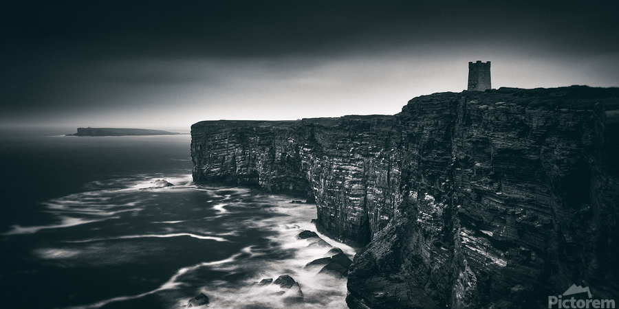 A monochrome panoramic view of the Kitchener Memorial at Marwick Head Orkney captured under stormy skies. The dramatic cliffs and rugged coastline add...[+]