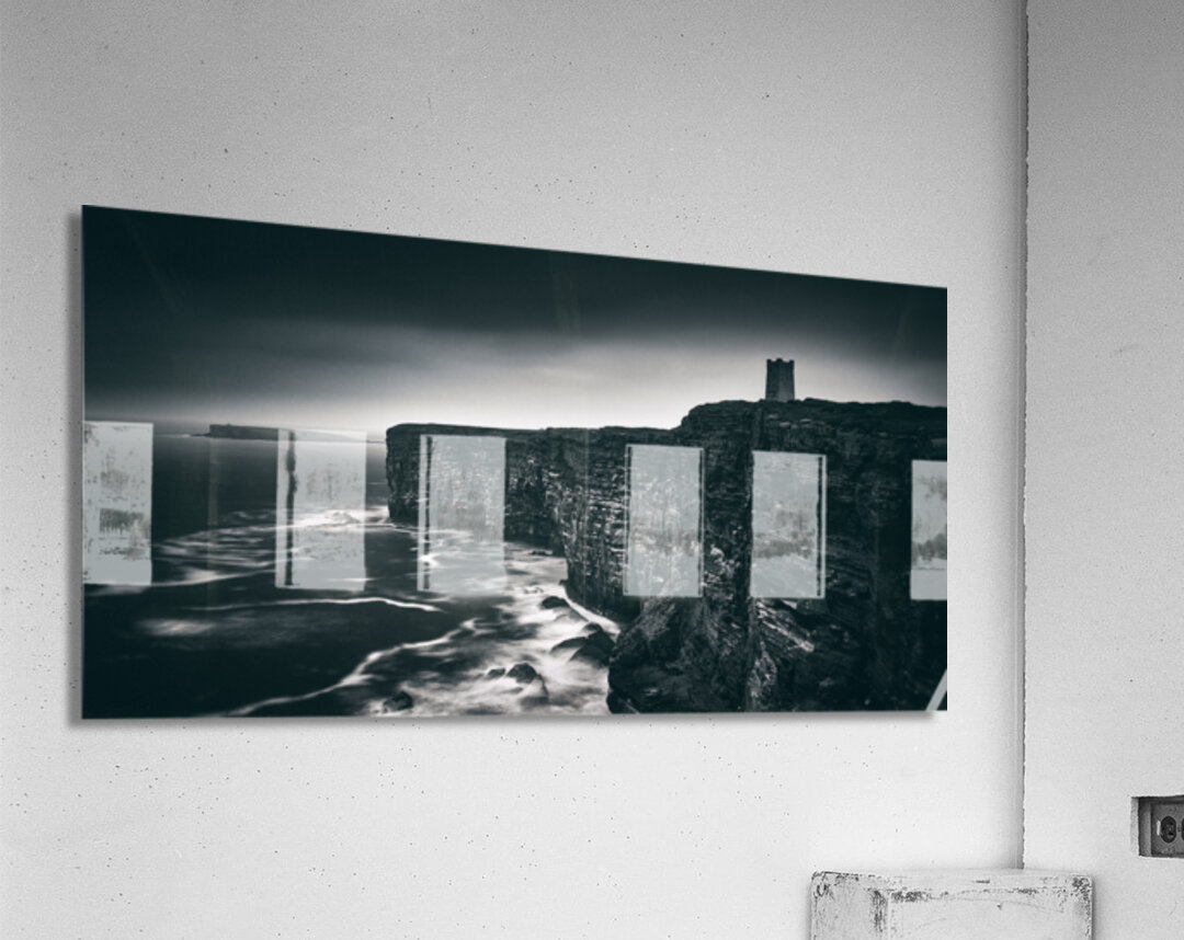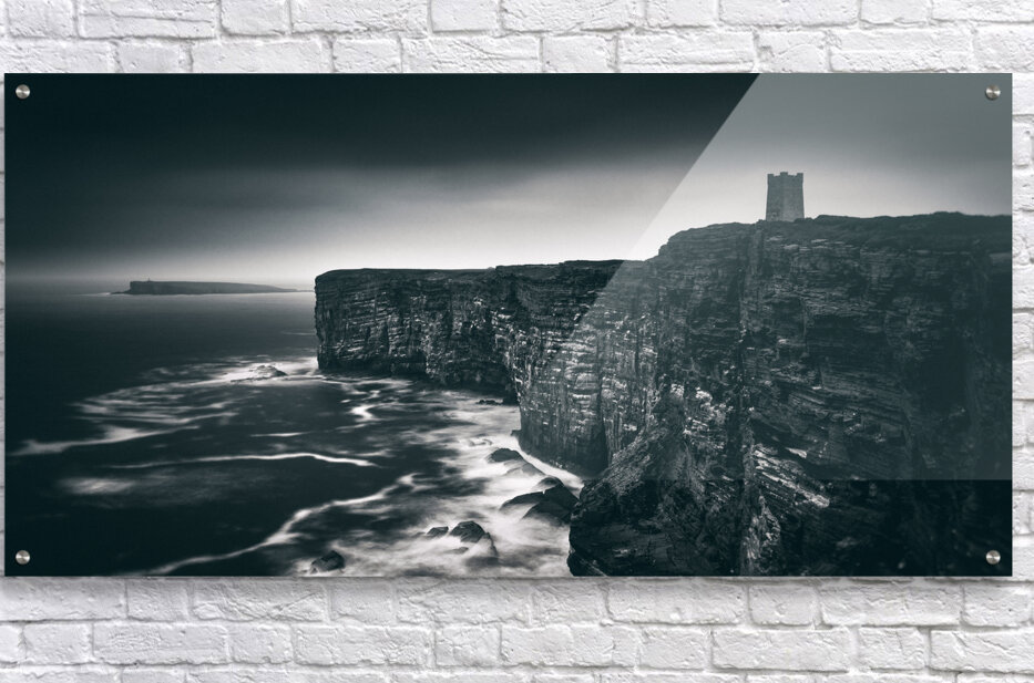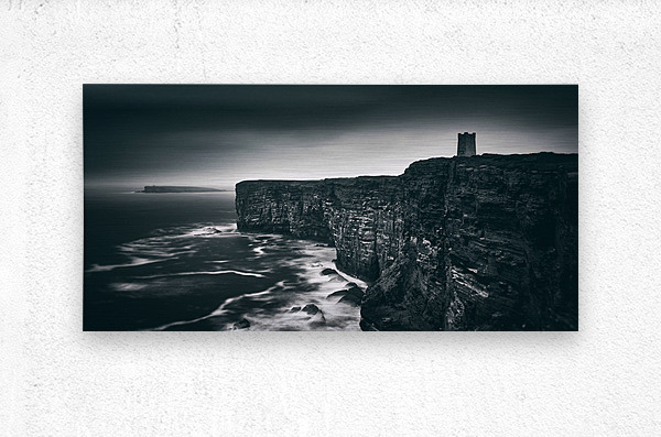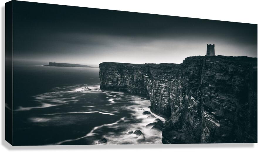 A monochrome panoramic view of the Kitchener Memorial at Marwick Head Orkney captured under stormy skies. The dramatic cliffs and rugged coastline add depth and atmosphere to this powerful landscape. The ideal photograph for lovers of historic landmarks coastal scenery and those seeking bold timeless wall art.
