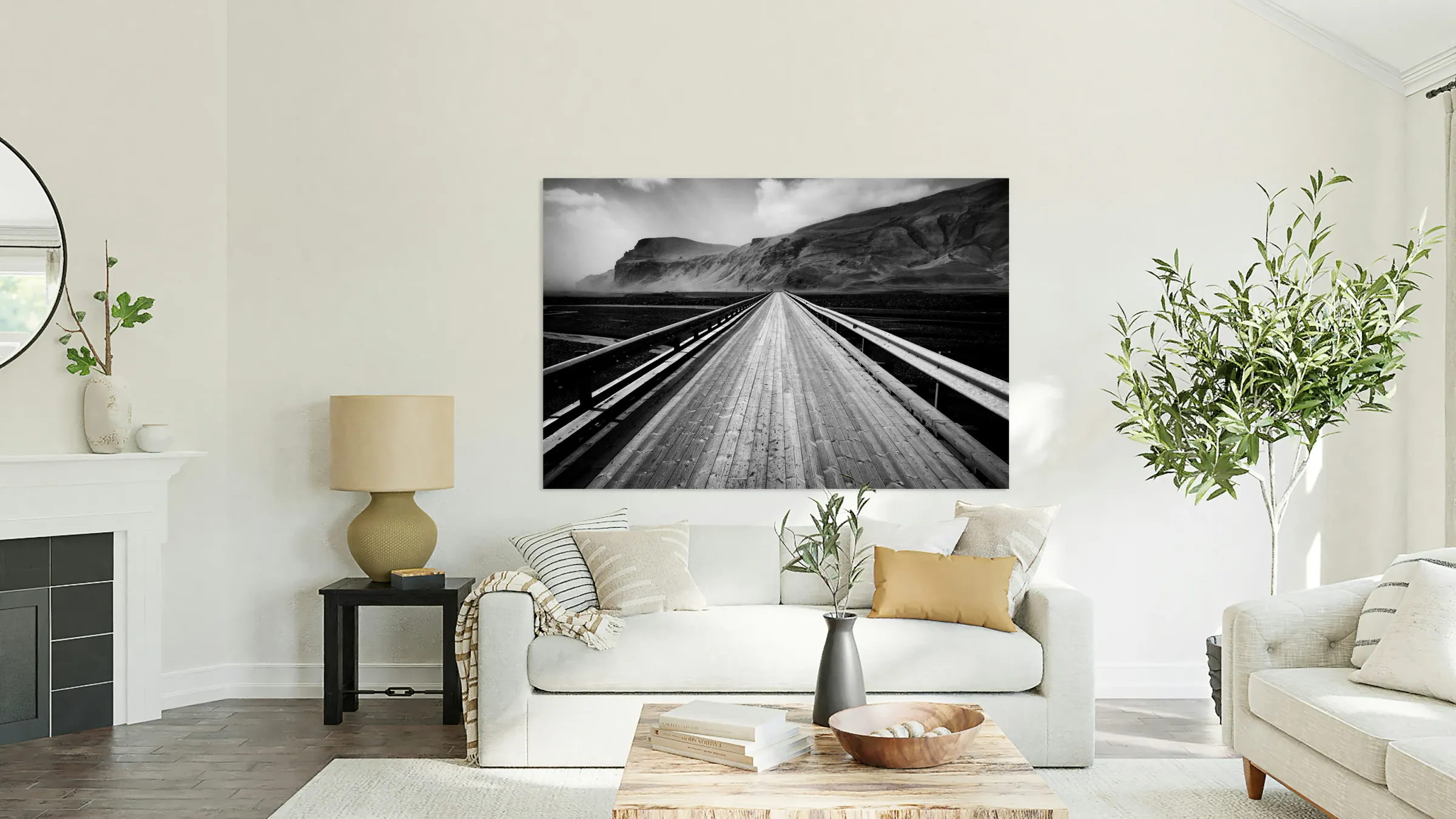 A monochrome photograph capturing the road leading to the Icelandic town of Vik with a wooden bridge crossing a remote landscape in southern Iceland. The quiet open road and simple bridge stand out against the stark black-and-white backdrop highlighting the vastness of the surrounding terrain. A perfect photograph for those drawn to minimalism isolation or the raw beauty of Icelands landscapes.