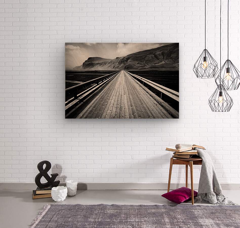 A monochrome photograph capturing the road leading to the Icelandic town of Vik with a wooden bridge crossing a remote landscape in southern Iceland. ...[+]