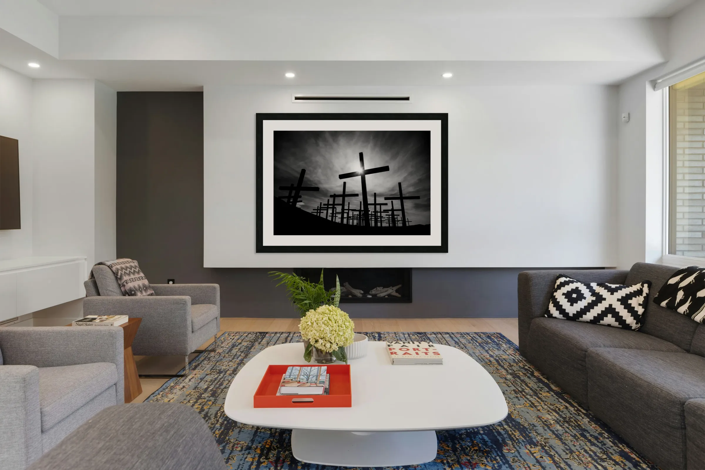 A monochrome photograph of an Icelandic roadside memorial with wooden crosses silhouetted against the sky and sun. The contrast between the crosses and the bright sunlight creates a stark simple composition. A great photograph for those searching for minimalist black-and-white imagery of Icelandic landscapes memorials or symbols of remembrance.
