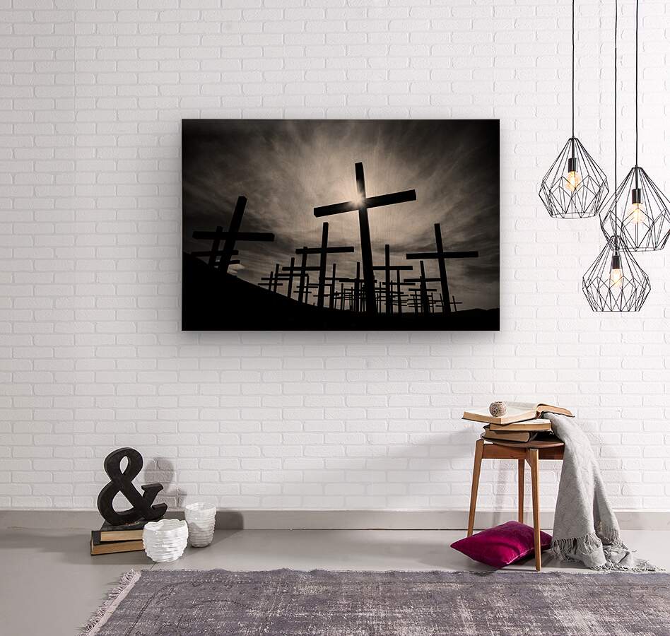 A monochrome photograph of an Icelandic roadside memorial with wooden crosses silhouetted against the sky and sun. The contrast between the crosses an...[+]