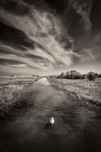 A monochrome photograph of a lone white swan gliding along an empty river in North Wales. The remote landscape and tranquil atmosphere are captured under a sky with soft wispy clouds creating a peaceful minimalist scene. A perfect photograph for nature lovers or those seeking serene imagery to complement calm quiet spaces.