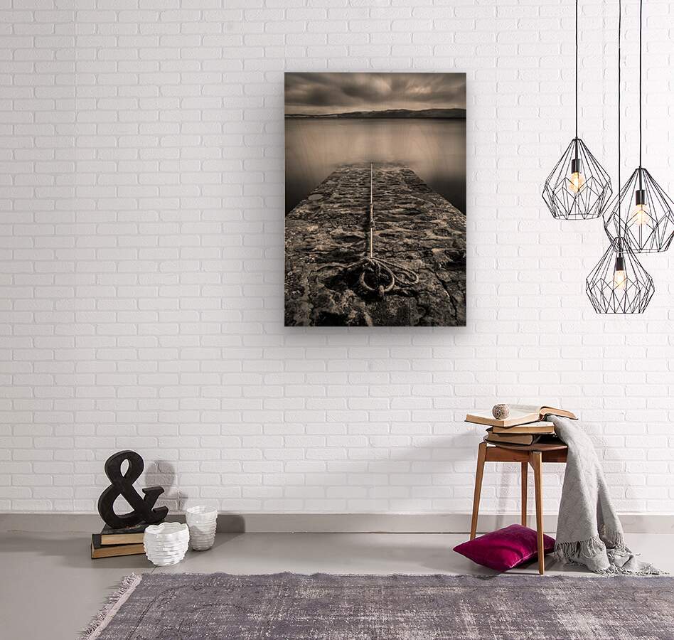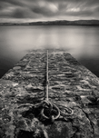 A monochrome long exposure photograph of a mooring ring and rope stretching into Loch Ewe taken from a stone launching ramp near Midtown in the Scotti...[+]
