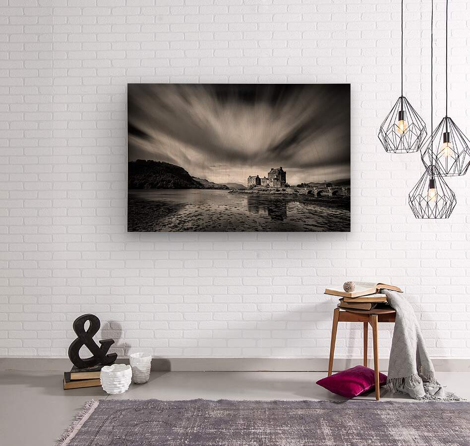 A black and white long exposure photograph capturing Eilean Donan Castle in the Scottish Highlands. The dramatic movement of clouds enhances the ethereal quality of the scene highlighting the castles architectural beauty against a dynamic sky. This photograph evokes a sense of history and majesty making it a perfect photograph for collectors of landscape art and lovers of Scottish heritage.