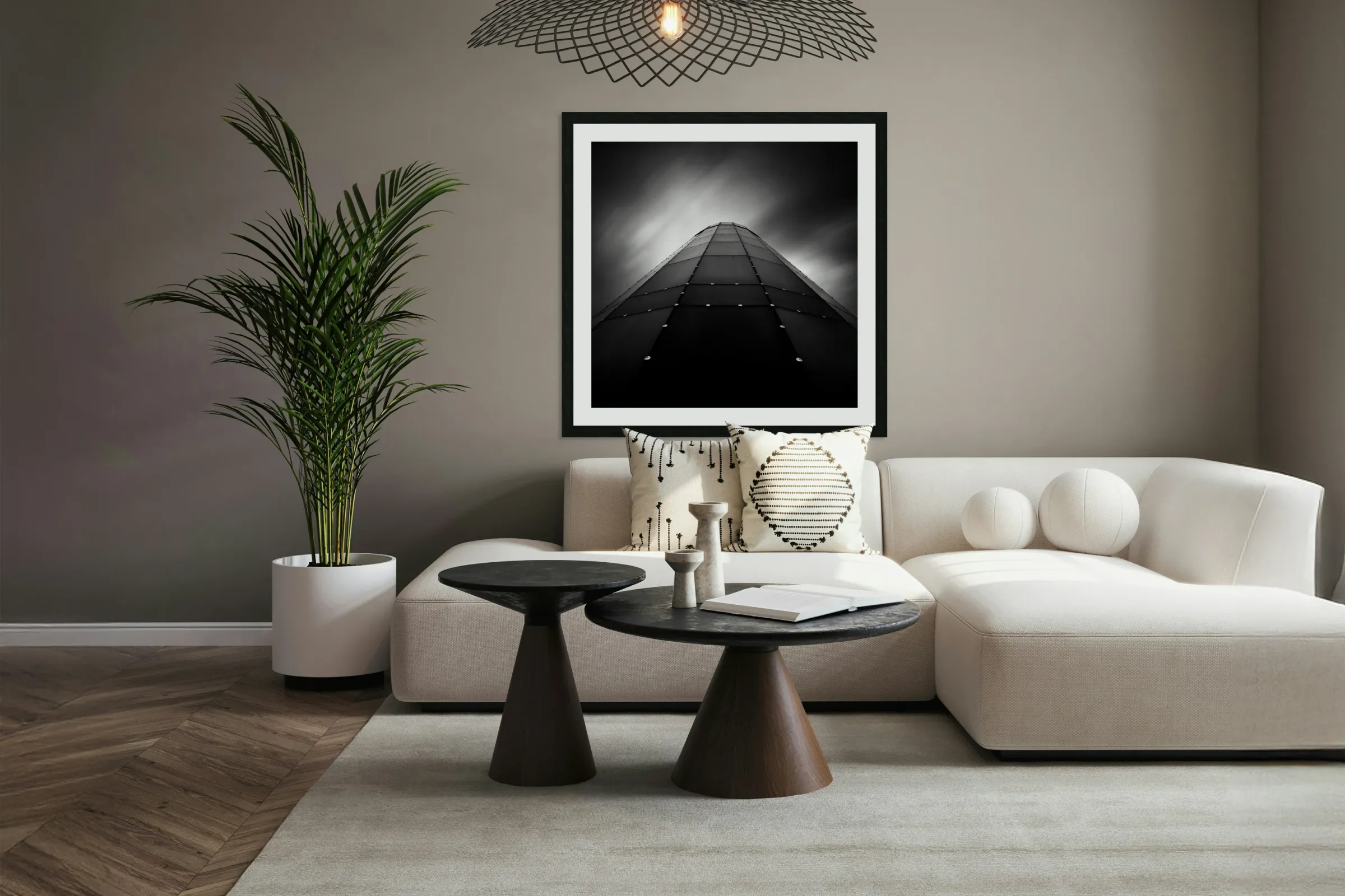A monochrome architectural study capturing the striking lines of a building in Amsterdam Netherlands viewed from below in a semi-abstract perspective. Clouds streak across the sky overhead softened by a long exposure enhancing the moody dark atmosphere of the composition. A great photograph for architecture enthusiasts and collectors drawn to expressive urban scenes.
