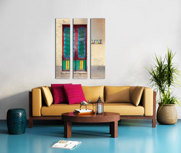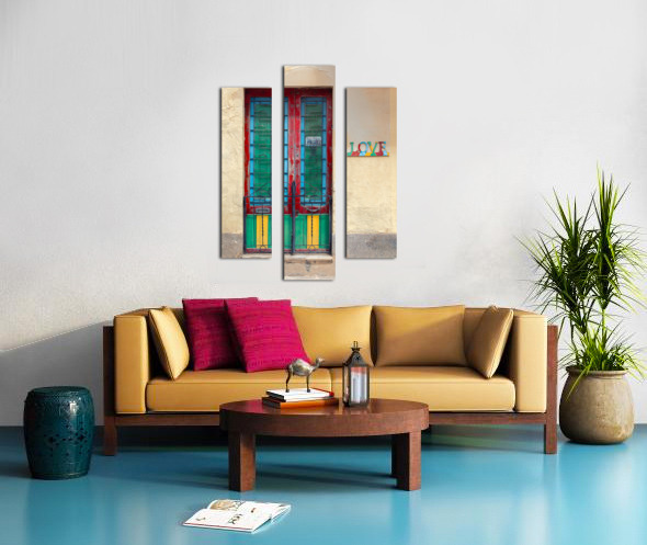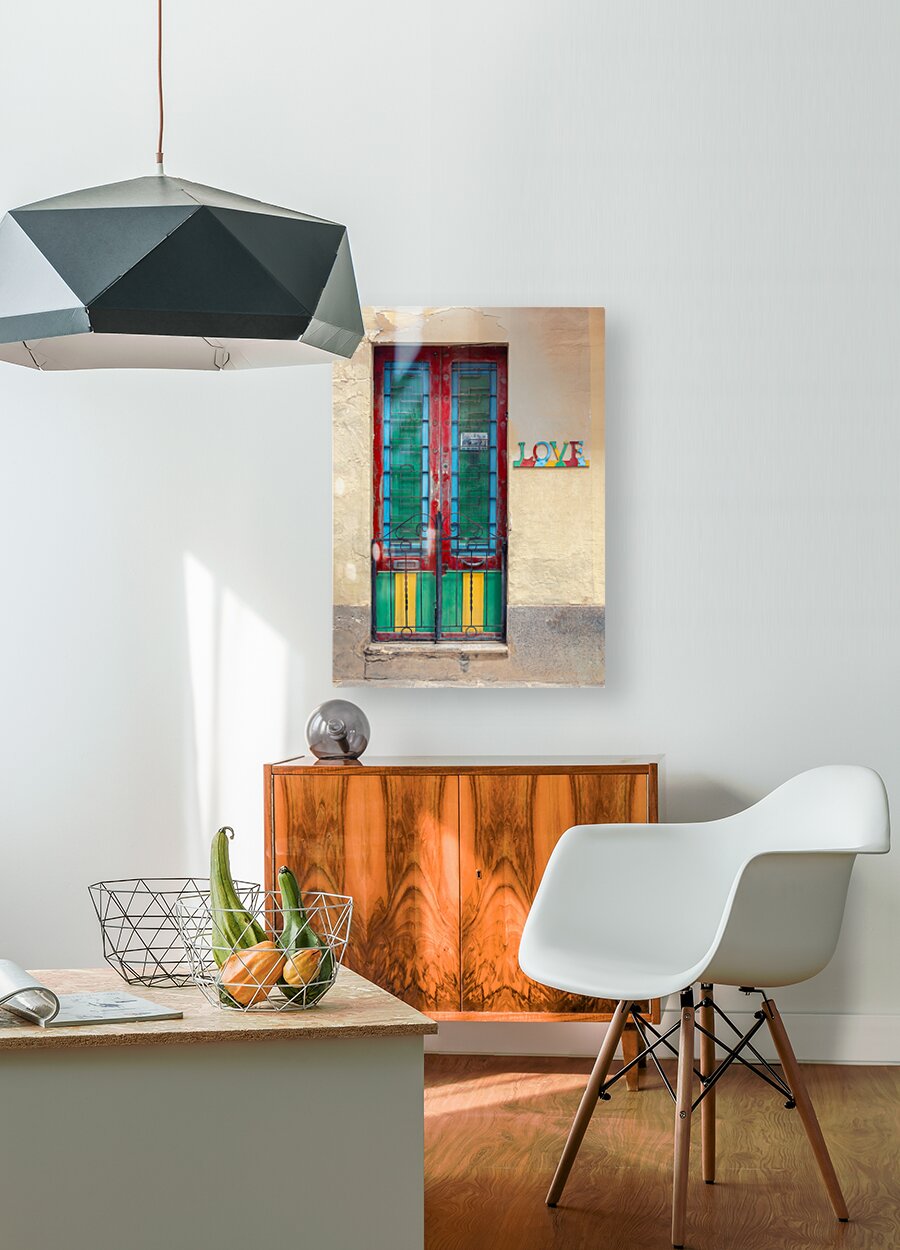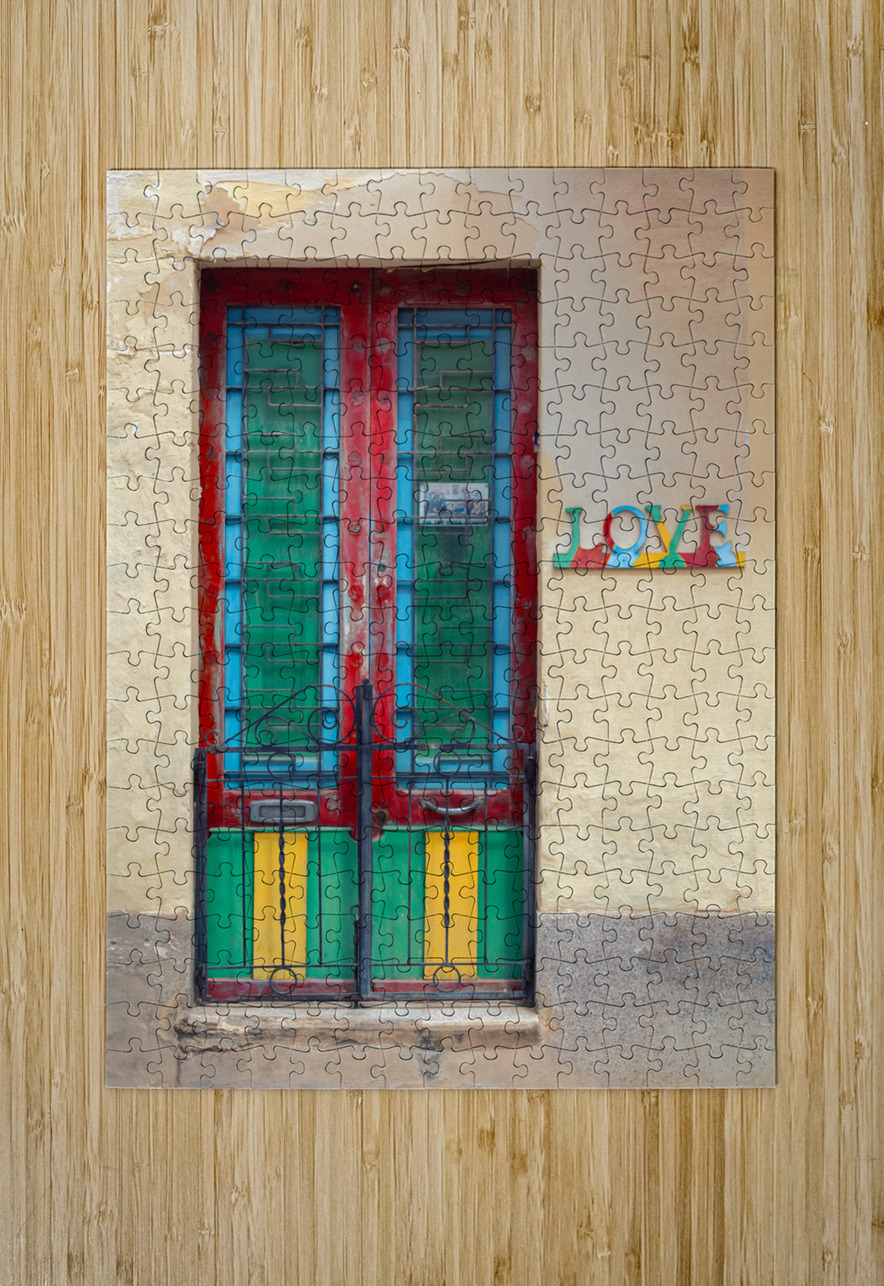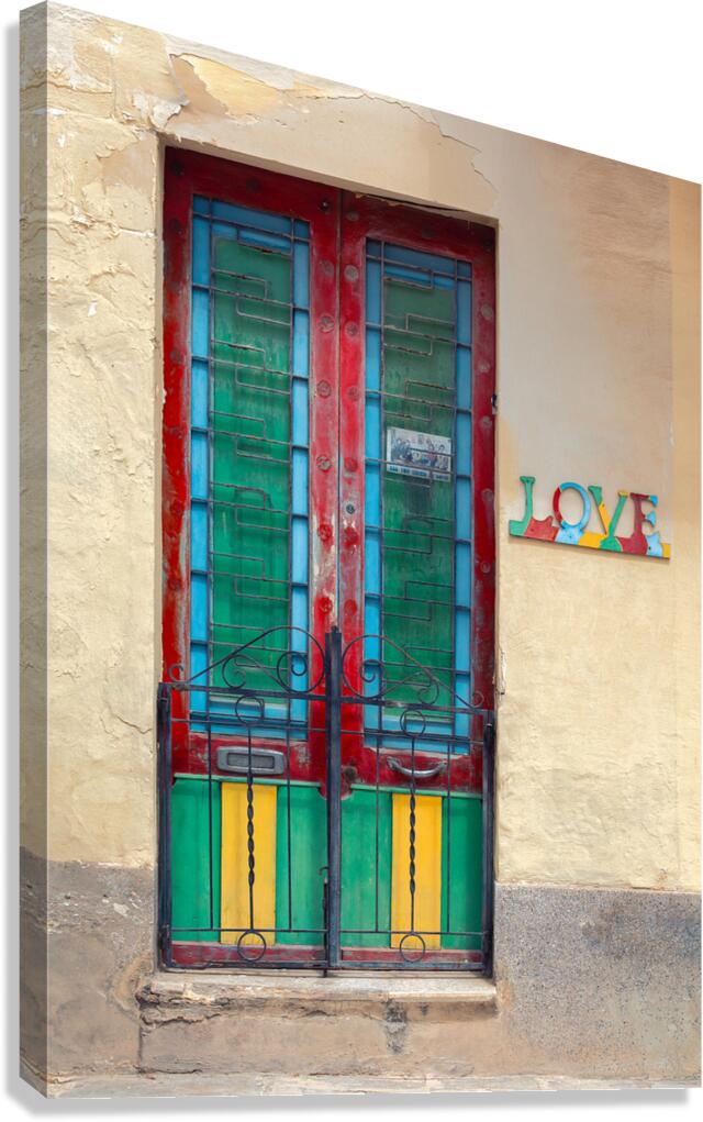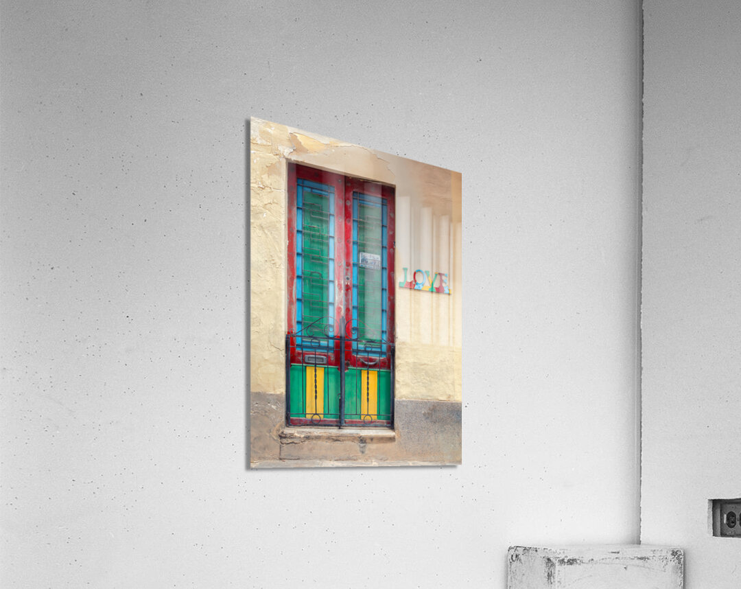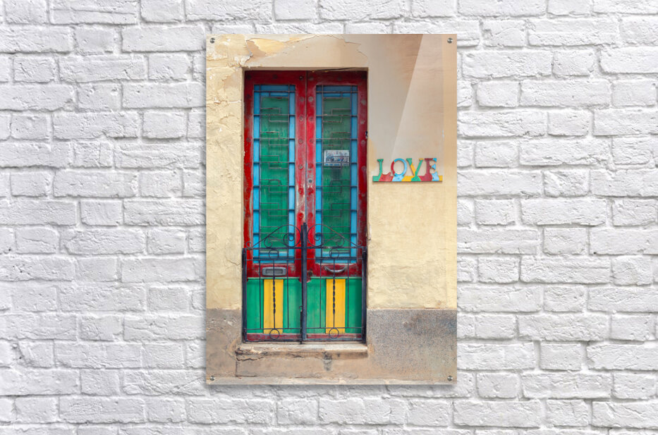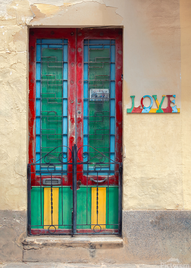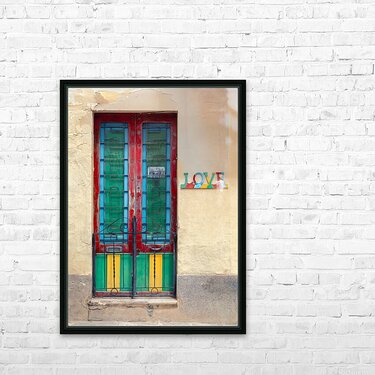 A vibrant and weathered Maltese door in Mosta Malta framed by a rustic yellow wall with colorful panels that bring out the charm of local craftsmanship. To the side a decorative sign spells LOVE each letter uniquely adorned with patterns and colors adding character and cultural depth. A perfect photograph for lovers of Mediterranean architecture art enthusiasts or anyone looking to bring a touch of Malta’s warmth into their space.