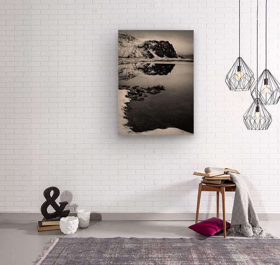 A monochrome photograph capturing the reflection of Stora Dimon mountain in a still icy pool in Iceland. The contrast between the rugged mountain peak and the reflective surface of the frozen water adds depth and tranquility to the scene. A great photograph for lovers of minimalist landscapes and monochrome art.