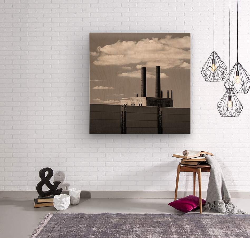 A monochrome photograph of the Union Station Power House in Chicago capturing only the top of the structure rising above a stone perimeter wall. The scene features a clear sky with clouds drifting above the power station creating a subtle impression of steam from the two large chimney stacks. A perfect photograph for architecture enthusiasts and collectors of urban landscapes.
