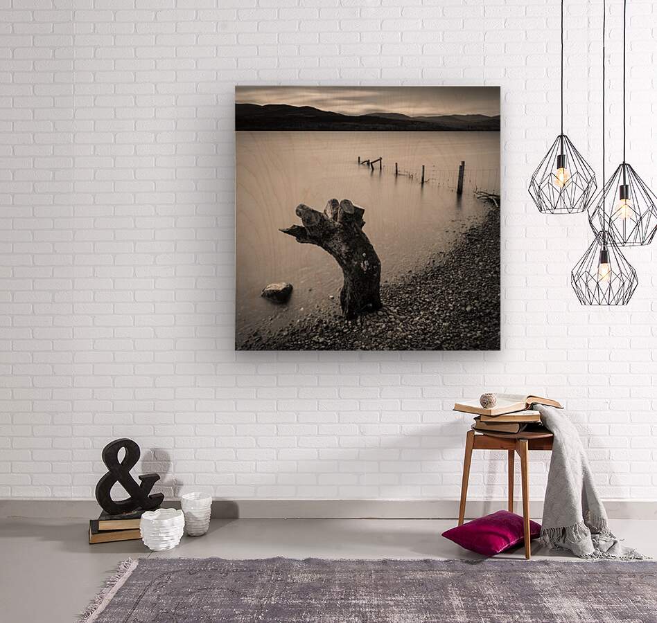 A monochrome long exposure photograph capturing a limbless tree standing alone on the banks of Loch Rannoch in Perth and Kinross Scotland. The stillne...[+]