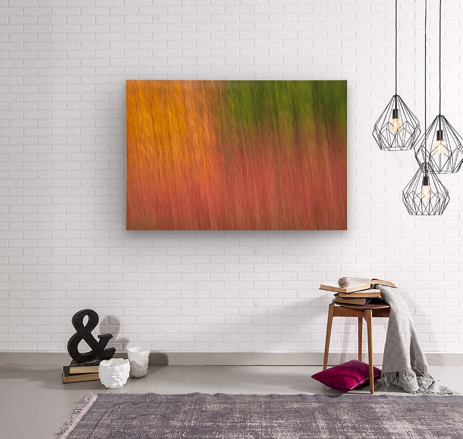 A calming abstract photograph showcasing pastel autumn colors in soft tones of orange green and red. Captured using intentional camera movement ICM within a quiet forest the colors blend and blur seamlessly evoking the gentle shifting beauty of autumn. A great photograph for those who appreciate subtle nature-inspired art with a minimalist touch.