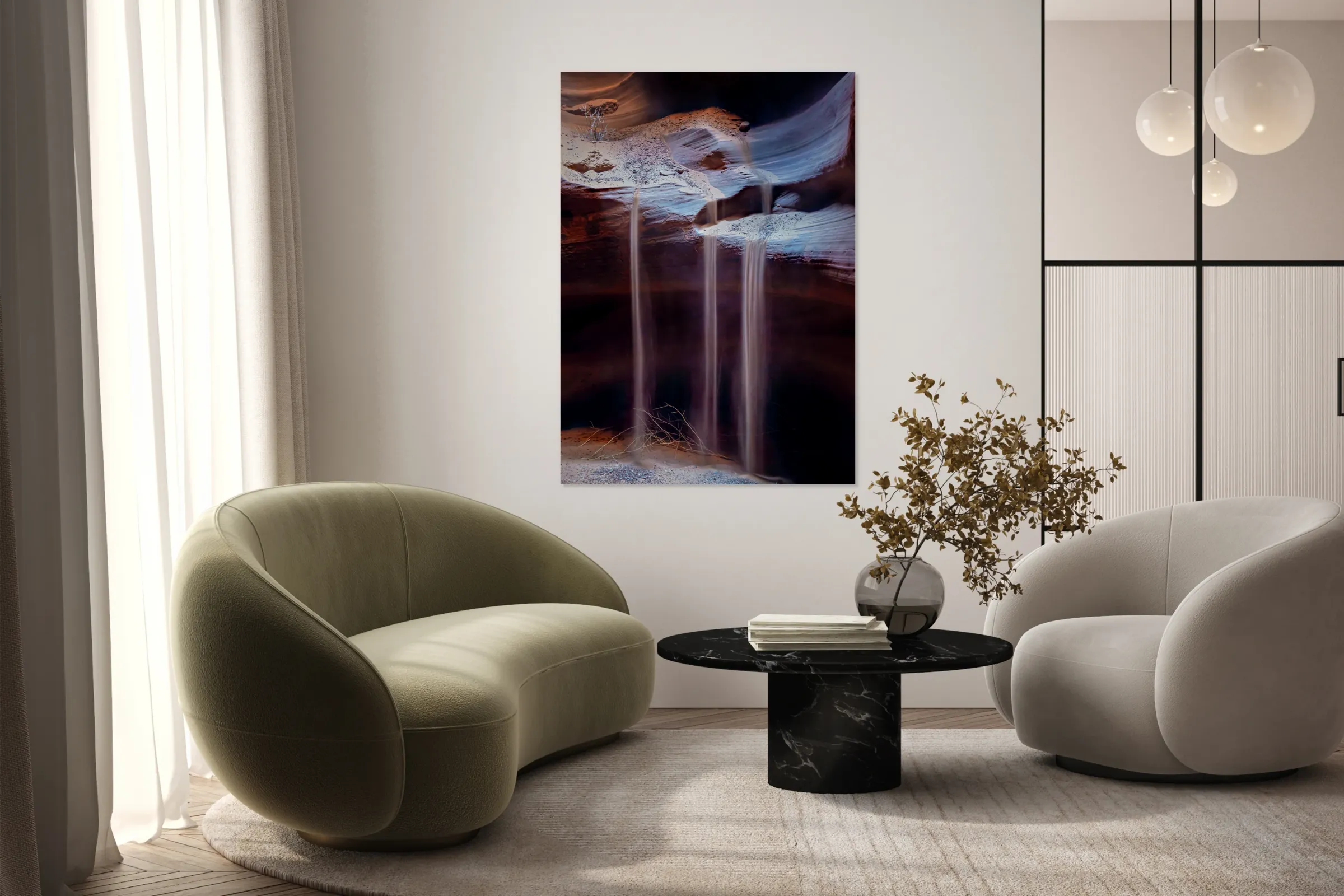 Sand gracefully cascading down the richly colored layered walls of Antelope Canyon in Arizona USA. The fine sand appears fluid in motion contrasting beautifully with the textures and curves of the canyon’s sandstone formations. This photograph captures the essence of the desert landscape highlighting the interplay of natural light and shadow that accentuates the canyons unique geological features. A perfect photograph for nature enthusiasts travelers and collectors who appreciate the timeless beauty of desert landscapes.