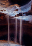 Sand gracefully cascading down the richly colored layered walls of Antelope Canyon in Arizona USA. The fine sand appears fluid in motion contrasting b...[+]