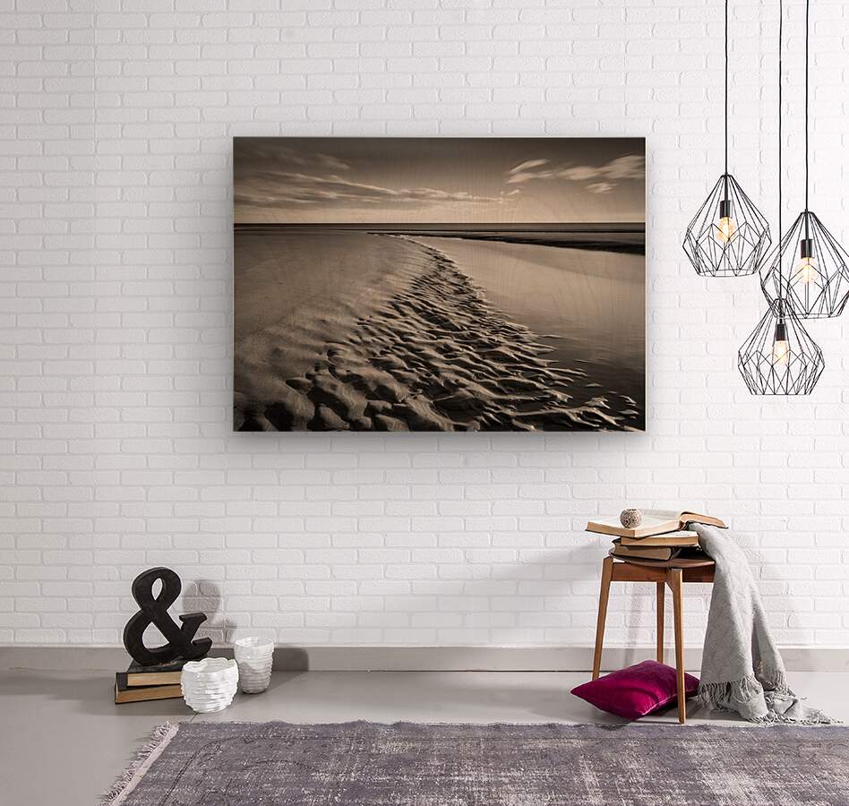 A monochrome photograph capturing the intricate patterns of sandbanks along the edge of the estuary at Lunan Bay beach Angus Scotland. The composition highlights the natural ripples in the sand and the gentle flow of water as it makes its way out to sea offering a tranquil glimpse of coastal beauty. A perfect photograph for coastal enthusiasts or anyone drawn to minimalist seascapes.