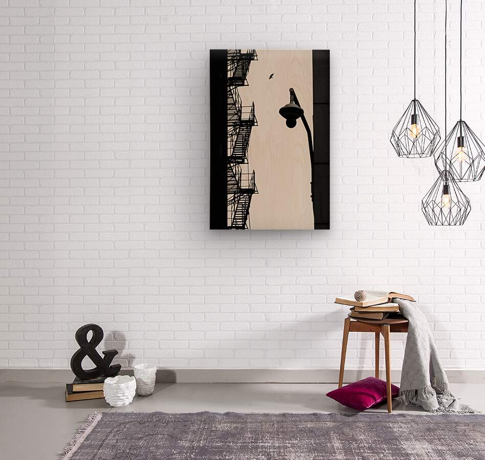 A black and white photograph of a Chicago back alley featuring the stark silhouettes of a fire escape descending the side of a building a solitary street light and a bird in flight overhead. The minimalist composition highlights the interplay of shadow and structure creating a sense of quiet urban solitude. A great photograph for those seeking artwork with a focus on simplicity and architectural forms. ..... Please Note: This image is intentionally presented with a grainy texture as part of its aesthetic.