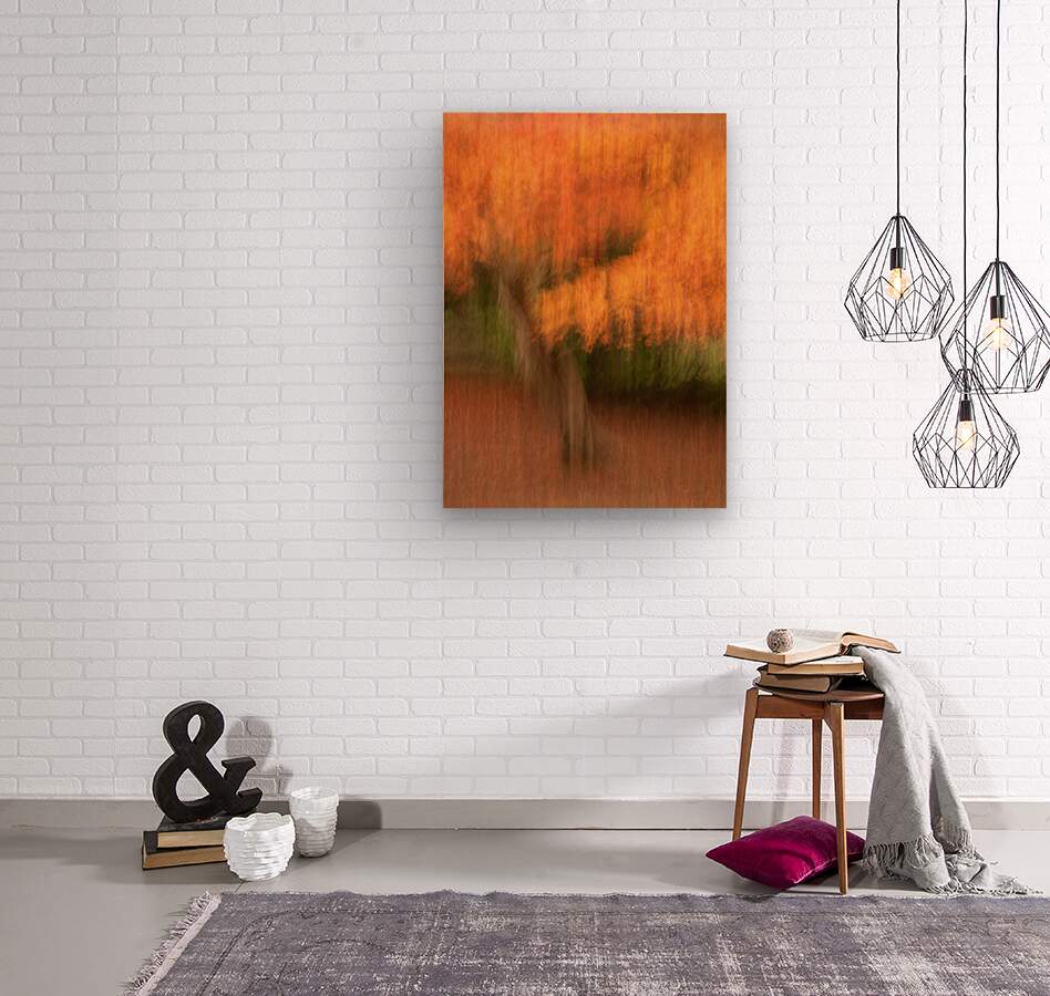 A semi-abstract photograph showcasing a tree with beautiful autumn leaves captured using intentional camera movement ICM. This artistic approach creates a shimmering effect transforming the vibrant foliage into a dynamic blend of colors and textures. The interplay of motion and light gives the image a unique dreamlike quality evoking the essence of the autumn season. A great photograph for art collectors or anyone looking to bring a distinctive touch of autumn into their space.