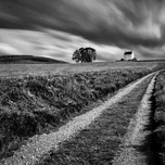 A monochrome long exposure photograph of the tracks leading towards Corgarff Castle in Aberdeenshire Scotland with dramatic clouds streaking across th...[+]