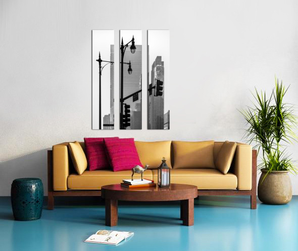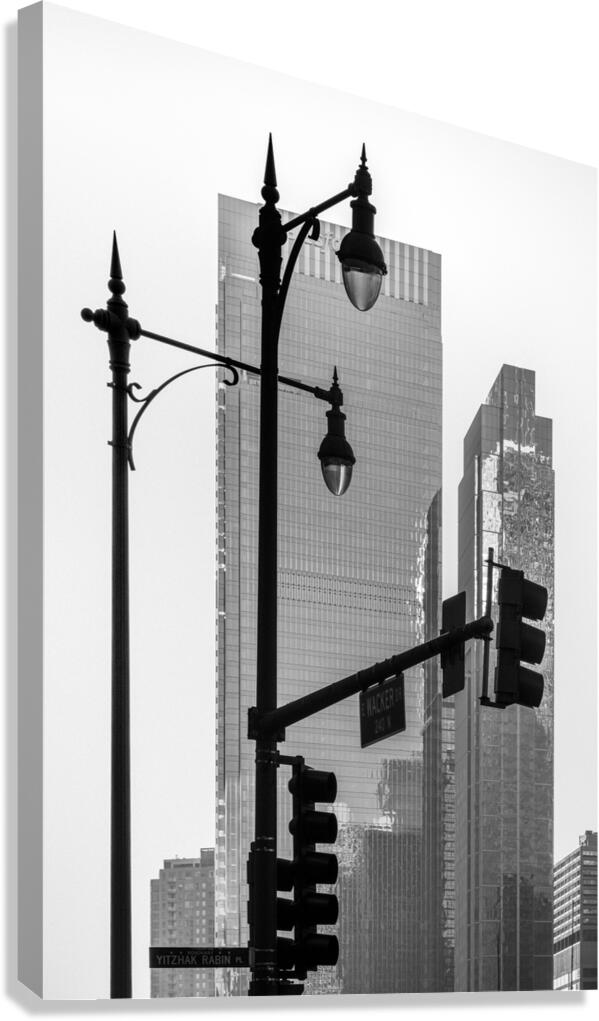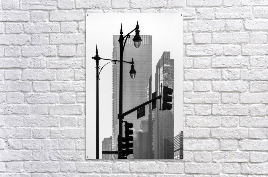 A monochrome photograph capturing Chicago traffic lights and streetlights in silhouette framed against towering city skyscrapers. Taken from the corner of East Wacker Drive and North Wabash Avenue the composition reflects the dynamic urban energy of the city. A great photograph for cityscape enthusiasts or collectors of urban-themed art.