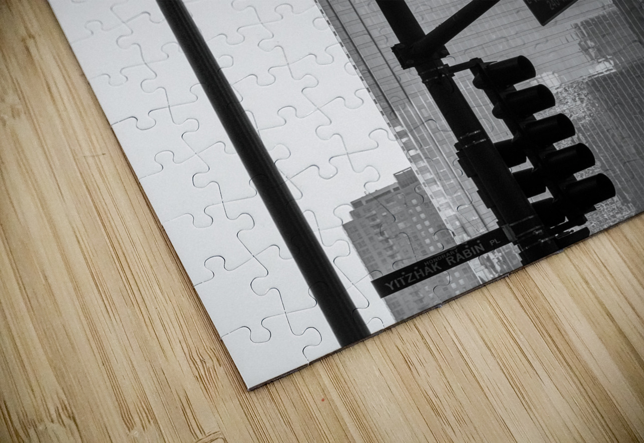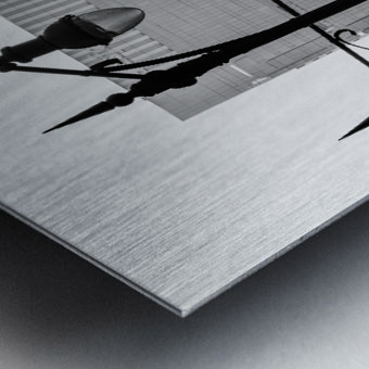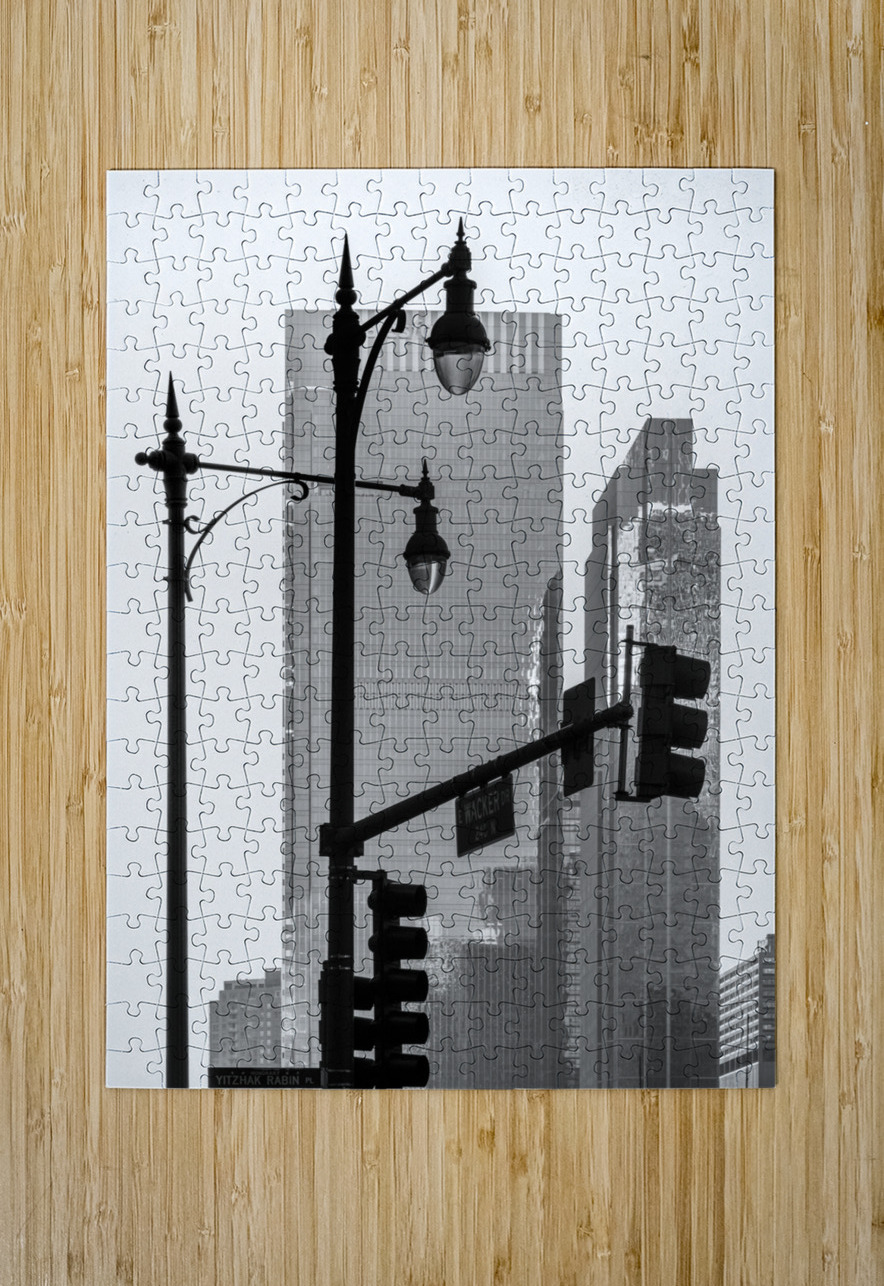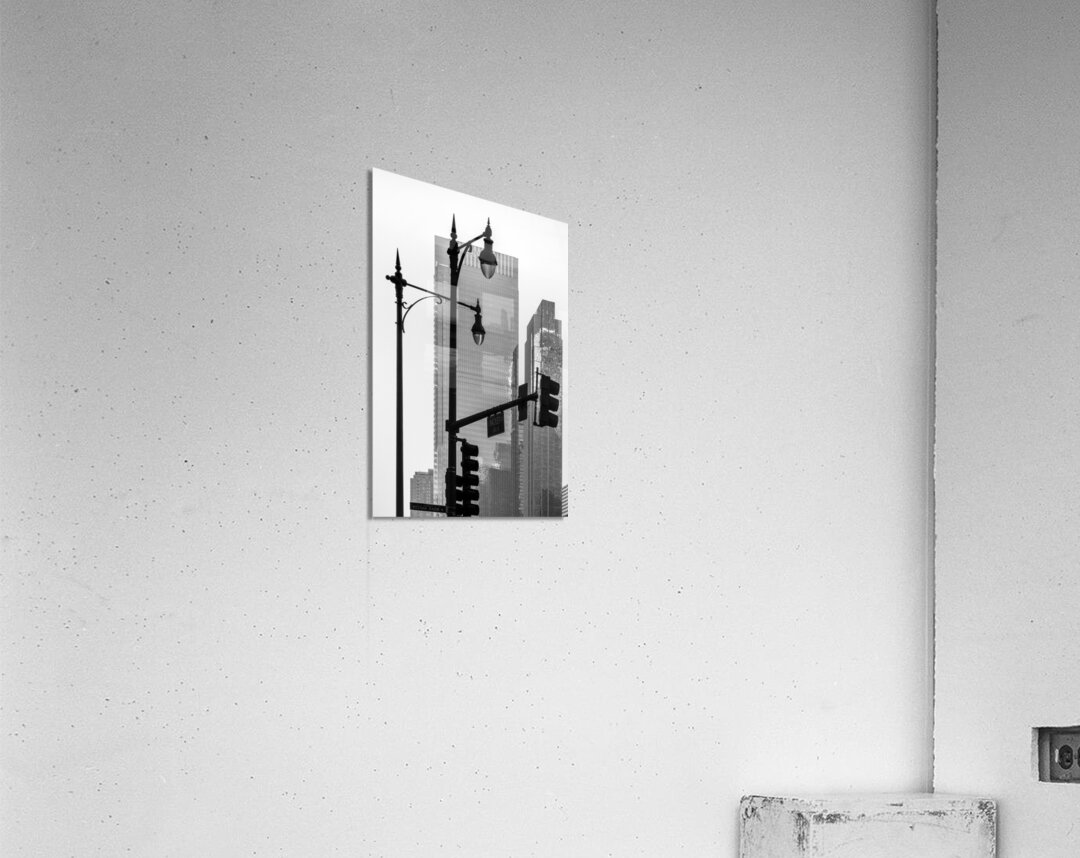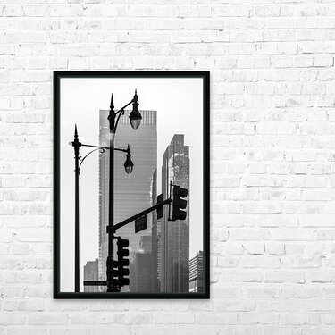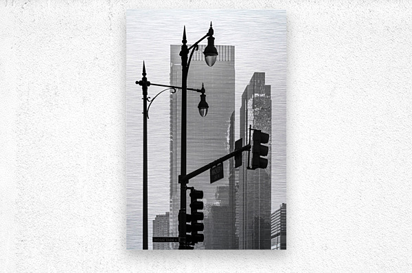 A monochrome photograph capturing Chicago traffic lights and streetlights in silhouette framed against towering city skyscrapers. Taken from the corne...[+]